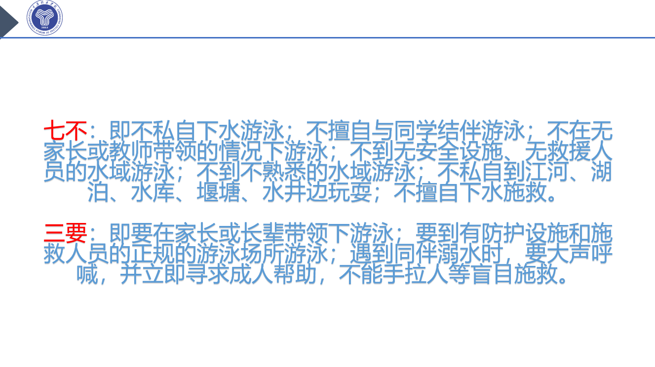 会议开始,辅导员彭薇薇老师就目前高温预警下发生的多起学生溺亡事故展开叙述,强调在暑假期间,正是溺水事故高发时期,我们要高度重视,时刻警醒,预防溺水:不私自下水游泳、不擅自与同学结伴游泳、不到无安全设施、无救援人员的水域游泳等“七不三要”。希望同学们牢记防溺水知识,掌握自救互救技能,保护自身人生安全,为自己负责,避免意外发生。