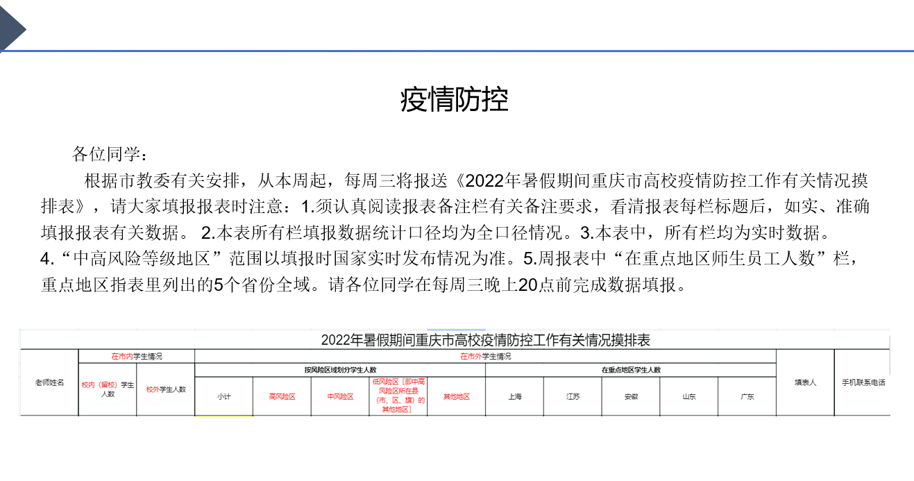 随着疫情防控防治工作的不断推进,阶段性成效显著,但我们防疫的干劲不能减,仍需时刻紧绷防控之弦。辅导员彭薇薇老师就目前国内疫情反复的形势叮嘱同学们要及时关注疫情防控信息,不乱跑不聚餐不出远门,维护自身心理健康,积极担当作为,配合学校和国家打好疫情防控的持久战。会议最后,辅导员彭薇薇老师希望同学们在暑假期间做好迎接大三学生新身份的准备,保持学习状态,规划好下学年的学习计划。