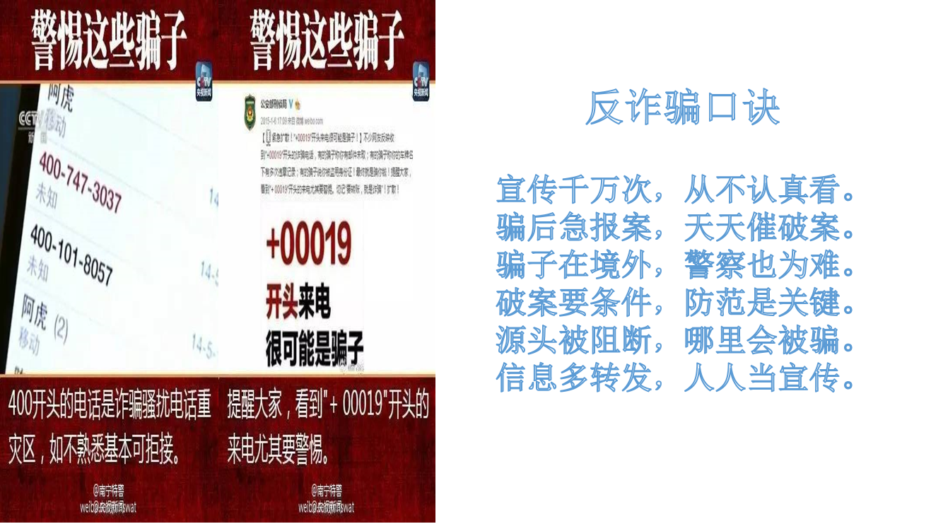 诈骗案件越来越多,诈骗手段也越来越高明,为帮助同学们识别诈骗伎俩,端正防诈骗态度,辅导员彭薇薇介绍同学们有可能遇到的骗局以及应采取的对应防骗手段。并补充道近期各大高校学生被骗的真实案例,分析大学生为什么会进入诈骗犯的圈套。在反诈保护圈的作用下,辅导员彭薇薇老师希望同学们做到不点短信链接、不给验证码、不谈卡号密码、不轻易打款汇款,提醒同学们要擦亮眼睛提高防骗意识,同时做好健康的心理建设,不轻信天上掉馅饼。