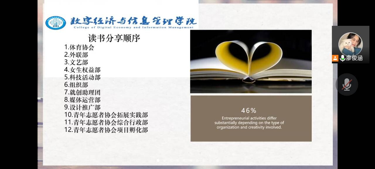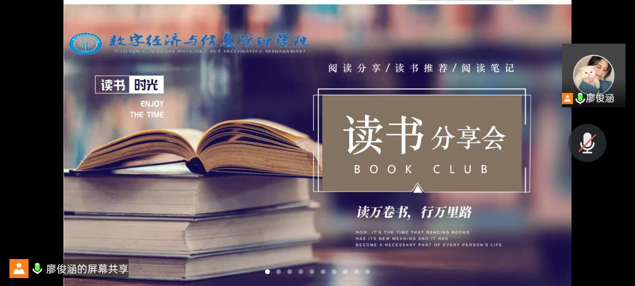 为营造浓厚的校园文化,让学生养成阅读习惯在阅读中品大咖商业思维。重庆移通学院数字经济与信息管理学院组织同学在2022年8月14日19:30开展了信息产业大咖阅读计划之“与书本为友,与大师对话”线上打卡分享活动线上读书会第二期。数字经济与信息管理学院团总支学生会全体成员参加了此次活动。
