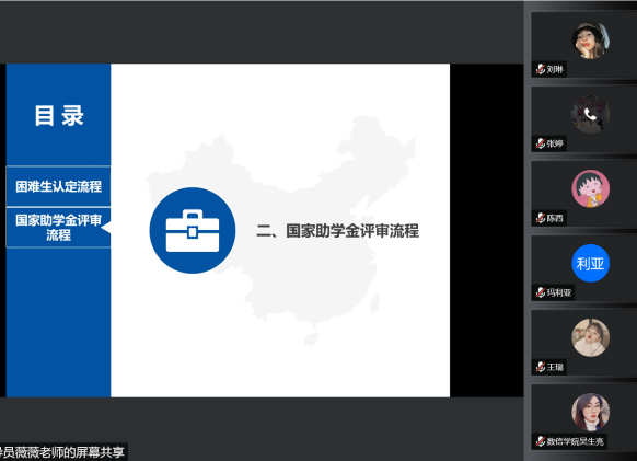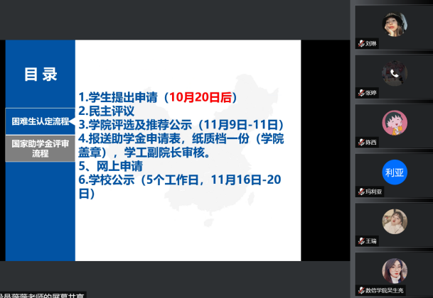 2022年9月20日晚上7点,数字经济与信息管理学院举行了2022-2023学年家庭经济困难学生认定工作及国家助学金资助的解读会议,特此邀请了2020级辅导员兼资助工作专项负责老师彭薇薇老师,对相关文件进行详细深入的解读,目的是为了帮助2022级新任辅导员老师以及其他正在进行该项工作的老师们掌握评定流程和认定方式。参加本次会议的有学院学工副院长任瑞娟,学工处主任廖阳,以及全体辅导员老师。