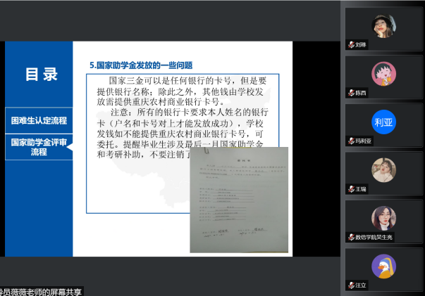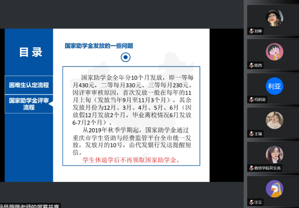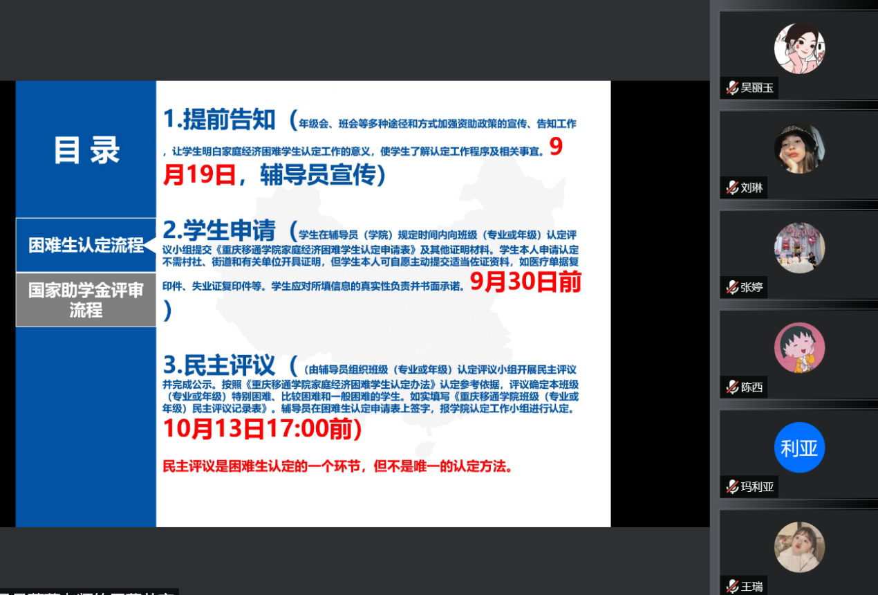 其次,彭薇薇老师对家庭经济困难生认定流程进行了详细讲解。主要分为以下步骤:其一,辅导员要通过年级会、班会等形式提前宣传、告知学生相关的资助工作,使学生了解认定工作程序和相关事宜。其二,学生按照要求提交《重庆移通学院家庭经济困难学生认定申请表》,保证所填信息真实无误并书面承诺。其三,组织评议小组进行民主评议,评定本班级(专业或年级)特别困难、比较困难和一般困难的学生,如实填写《重庆移通学院班级(或专业)民主评议记录表》,参会人员在困难生认定申请表上签字。其四,以班级(专业或年级)将评定结果进行1-2个工作日的公示,再上报至学院进行2个工作日的公示。其五,学生在系统上填报困难生申请表,辅导员老师认真检查学生填报的信息,根据民主评议结果及时完成系统审核。其六,学院审核通过后,提交材料至学校公示,学校公示期为3个工作日。