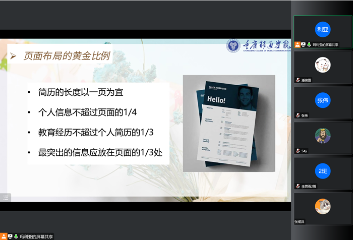 大鹏一日同风起,扶摇直上九万里!马莉老师与同学们进行亲切交流,并给同学们鼓舞士气。同学们在线上情绪高涨,踊跃抒发对未来就业的美好愿景,争先恐后分享自己未来的就业方向,对自己的未来表达美好祝愿。我们相信,梦里能到达的地方,总有一天,脚步也能到达。长风破浪会有时,直挂云帆济沧海!愿所有的同学都能把握青春,梦想成真!