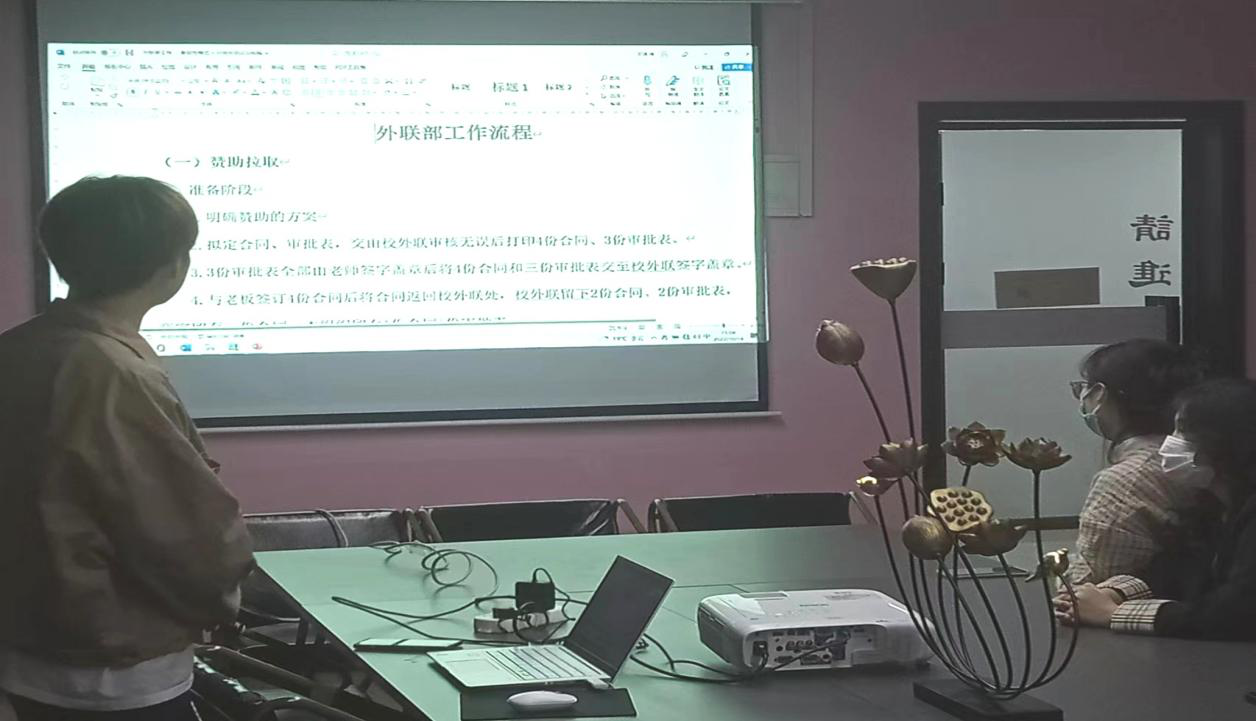 外联部的发展少不了相关技术培训,外联部张云龙从外联的技术培训出发,结合自身学院实际,从外联部的介绍、外联部的具体工作流程和外联部对学校的意义三个方面进行阐述,对外联部的具体工作流程中的赞助事项和外联审批流程做出着重讲解。帮助干事了解外联部职能,明确自身工作要务,推动外联后续的工作开展。