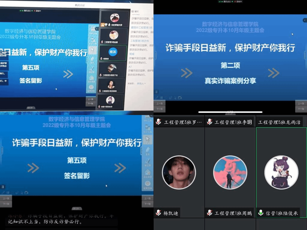 本次年级会采取线上线下同时进行的方式,为更多的同学提供了防诈反诈,财产安全的知识宣讲,部分同学虽未能感受线下宣讲的火热气氛,但线上弹幕的讨论仍然热火朝天。