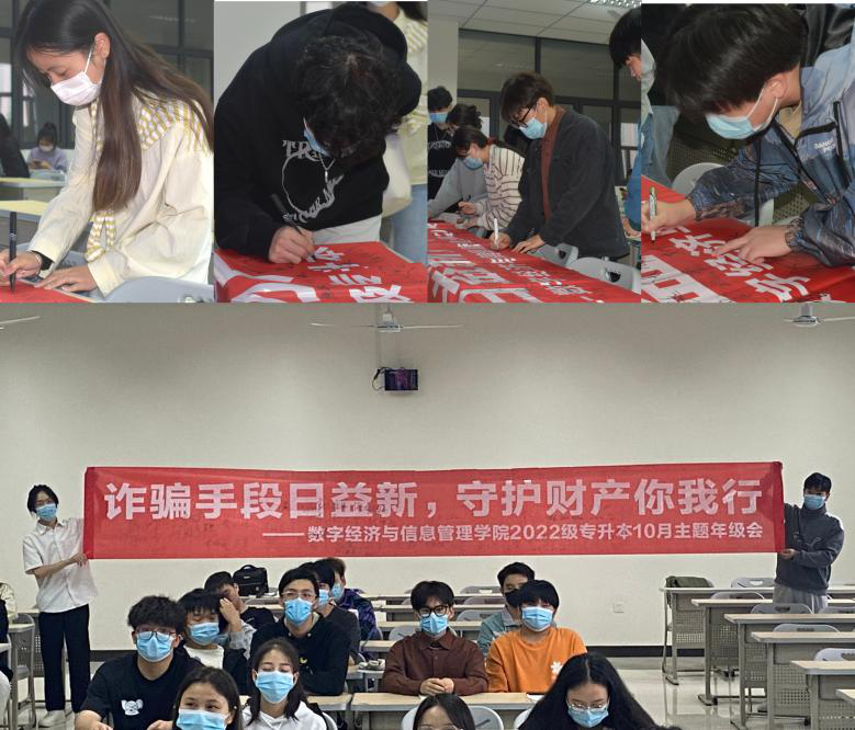 从实践上落实防诈反诈行动,参会同学共同宣读防诈反诈11句口诀,让同学们能够在学习防诈反诈知识的同时进一步树立维护自身财产安全意识,提升防诈反诈工作开展的成果;我们生活在一个由亲情、道德、责任、义务等等所交织的一张密切的关系网中,为了个人的成长,为了家庭的幸福,为了社会的稳定,防诈反诈,保护自身财产,从我做起,从大家做起。