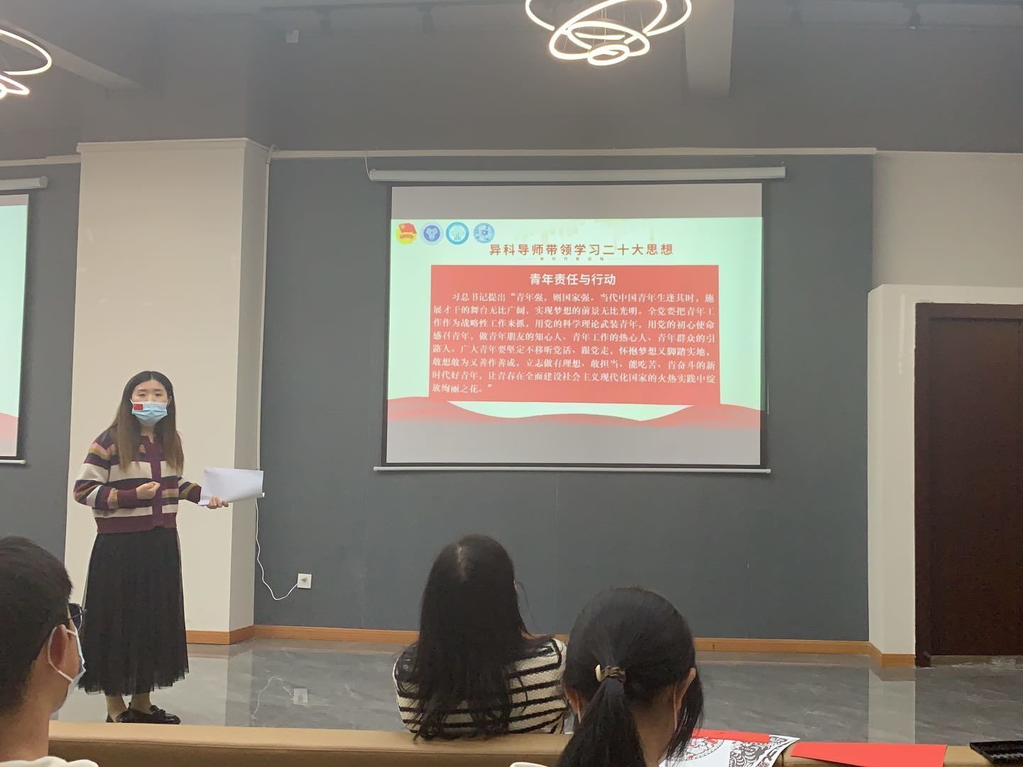 少年智,则国家智;少年强,则国家强。习近平总书记在中国共产党第二十次全国代表大会上指出,全党要把青年工作作为战略性工作来抓,用党的科学理论武装青年,用党的初心使命感召青年,做青年朋友的知心人、青年工作的热心人、青年群众的引路人。为深入学习习近平新时代中国特色社会主义思想,重温青年运动,百年历程,鼓励青年自强不息、砥砺前行。数字经济与信息管理学院2021级数字经济专业03团支部于2022年10月25日在南湖书院多功能影音室开展以青春心向党,共赴新征程为主题的团日活动、异科导师见面会。本次活动分别邀请到异科老师廖进老师、辅导员刘琳老师。