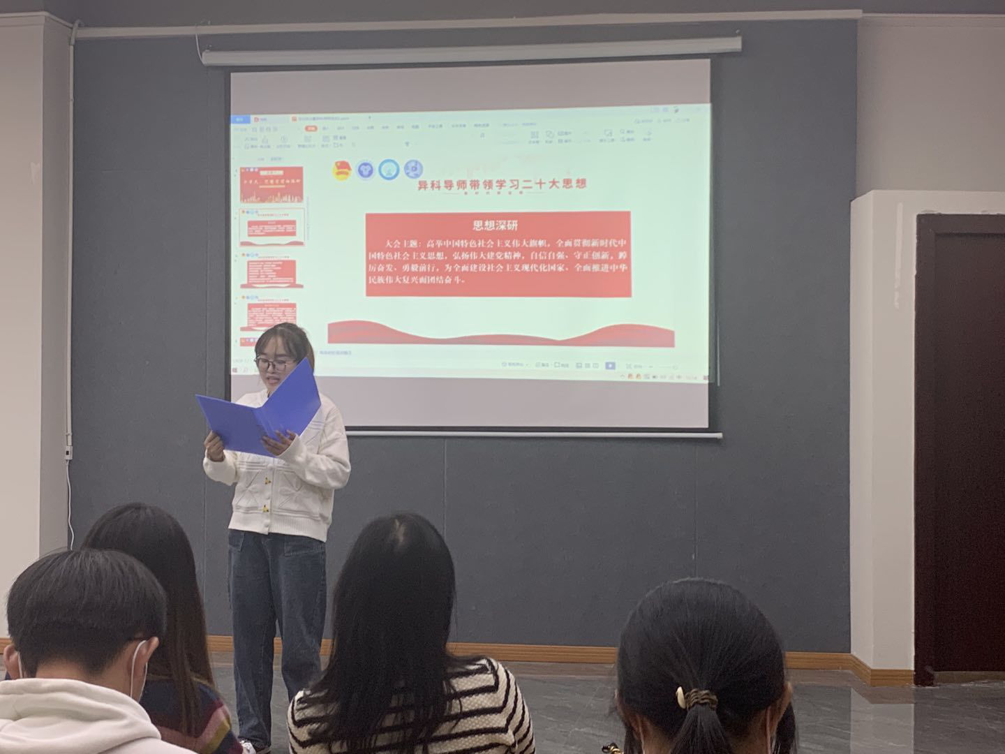 活动伊始,由我班异科导师廖进老师为我们深入讲解中国共产党第二十次全国代表大会。廖进老师为我们讲解这十年来三件大事,中国共产党成立一百周年,中国特色社会主义进入新时代,我们完成了第一个百年奋斗目标等,并强调我们是社会主义接班人,责任重大,应当忠诚履职,承担责任,发挥好青春的活力,奋进征程,一心跟党走。通过廖进老师的讲解,同学们对党的知识和目标有深入地了解,不仅加强党建教育,更提高同学们学习党史的积极性。