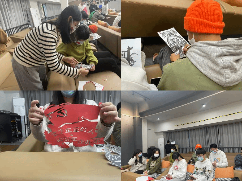随着活动的推进,在主持人的带领下老师和同学们进入了红色剪纸刻画的活动环节。一张张画有党国美好祝福语言的红纸被同学们小心翼翼的拿在手中,是敬仰也是满心的真诚。拿起手中的笔刀,一笔一画,笔尖倾泄下的是同学们心中对党的敬畏,对国家的热爱,更是对未来美好的期许。老师们也满怀热情的参与其中,在刻画红纸的同时分享着她们对于党国的浓烈情怀,不断传递着对于理想的坚定信念,号召着我们青年大学生不要畏惧眼前的困难,人生要像刻画红纸一样细致认真,一笔笔的描画清楚,印刻下人生精彩的每一瞬间。此刻,师生情与爱党爱国情深深交织在一起并汇聚在这一张张充满理想信念的红色剪纸上。