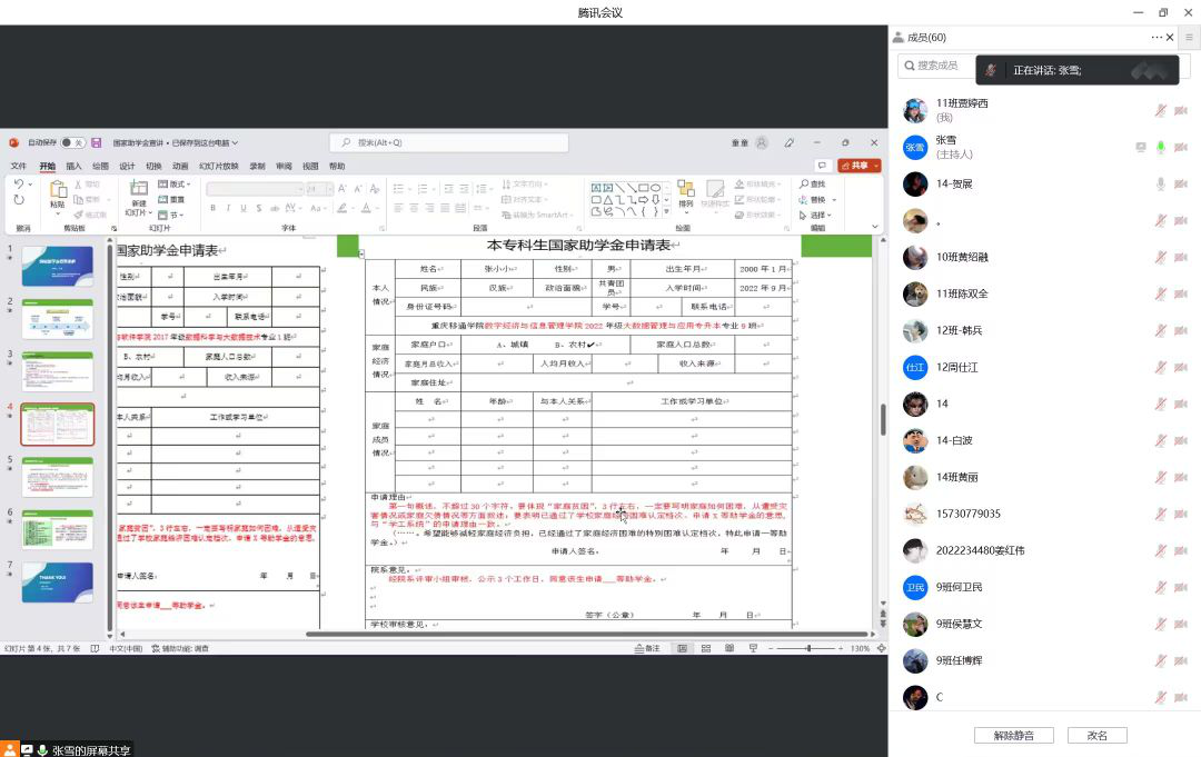 会议的最后张雪老师再次提醒同学们填表注意事项。例如必须是经认定为家庭经济困难的学生;申请理由的末句建议写上:经过班级,院系,学校的审核,本人所述情况已经通过家庭经济困难认定档次、特此申请X等助学金;每年助学金发放10个月,2月、8月不发放国家助学金;以及确定相关提交时间,并督促各班生活委员需仔细检查无误后再提交。