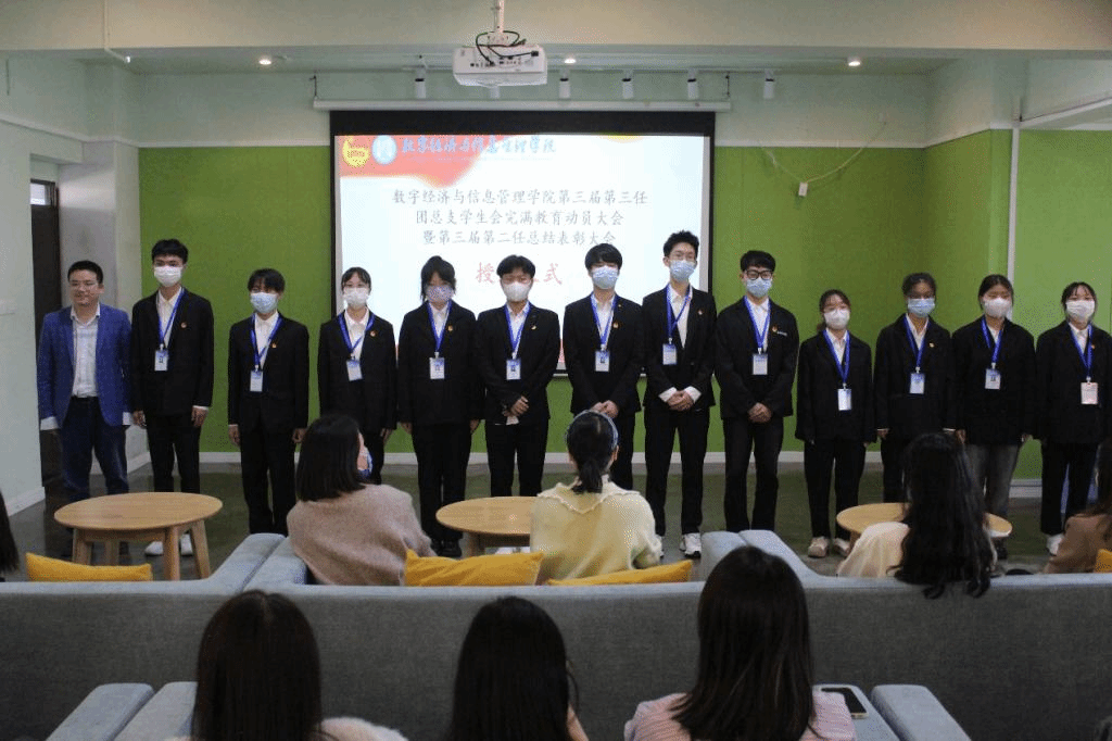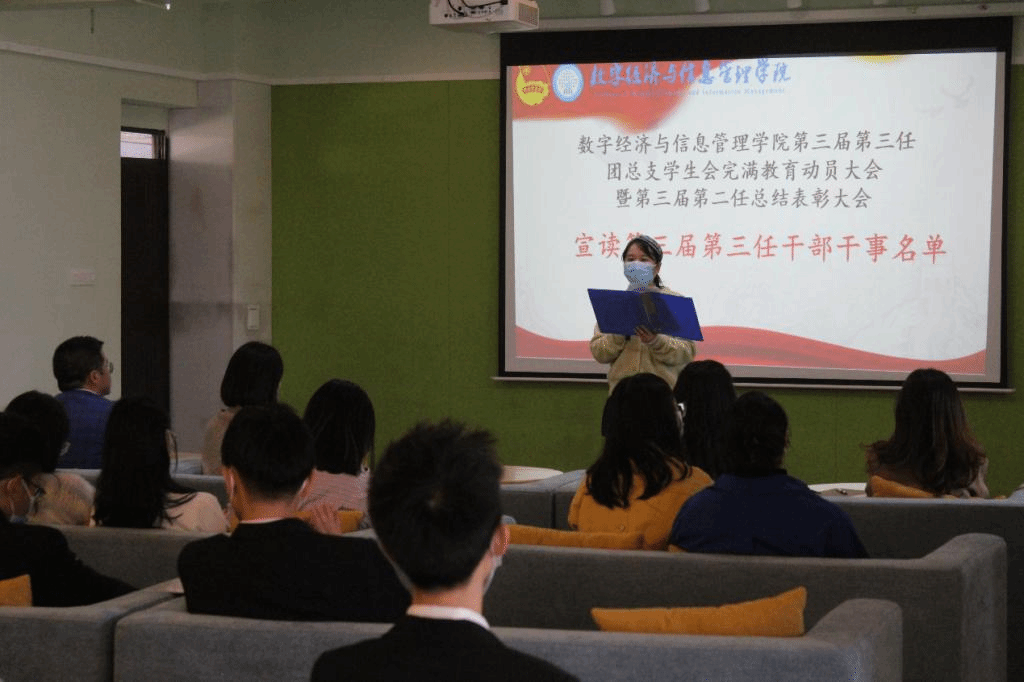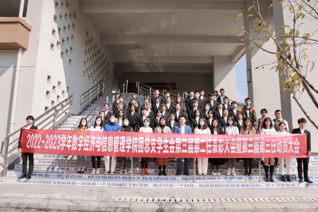 苍龙日暮还行雨,老树春深更著花。为加强数字经济与信息管理与信息管理学院团总支学生会全体成员的归属感及认同感,积极推进组织建设,数字经济与信息管理学院于11月1日中午12:10在双栀书院多功能影音室开展数字经济与信息管理学院第三届第三任团总支学生会完满教育动员大会暨第三届第二任总结表彰大会。本次会议有幸请到数字经济与信息管理学院学工副院长任瑞娟老师,学生工作办公室主任廖阳老师,团总支书记马莉老师,党建工作负责老师王瑞老师、汪立老师,志愿服务版块指导老师彭薇薇老师、张雪老师,社团活动版块指导老师刘琳老师、吴丽玉老师,竞技体育版块指导老师吴生亮老师,艺术修养与实践版块指导老师路丽帆老师、陈西老师出席本次活动。