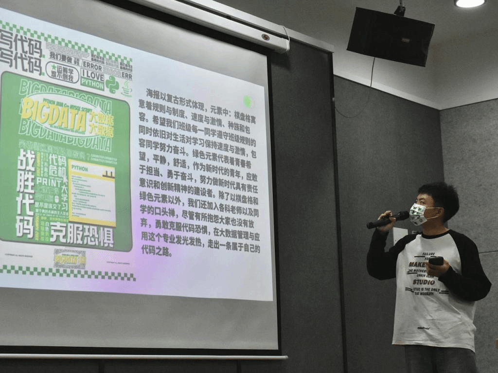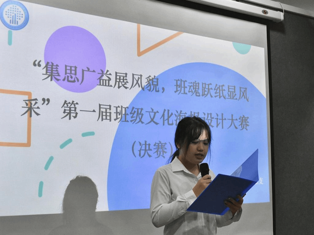 在决赛答辩环节中,一个个天马行空、风格各异的想象喷涌而出,展现在评委老师的眼前。每幅海报都充斥着同学们对自己班级文化的诠释,这一幅幅海报展现出来的活力热血、团结同行、青春无悔……无一不传递出属于他们自己的班级文化与完满理念。通过每位答辩选手的解读,也让评委了解到了他们心中班级雏形与大学展望。