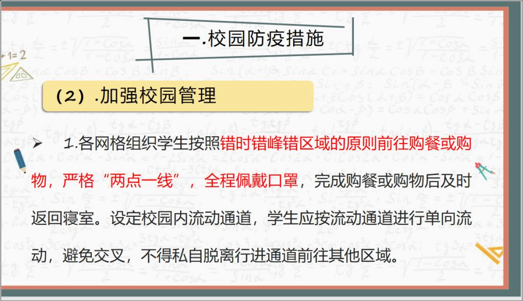接下来,吴老师强调了学校近期防疫政策,表示坚决阻断校外可能的疫情传播链。并针对面对疫情冲击带来的心态改变,在会议上积极开展心理健康教育工作,减轻学生心理压力、缓解紧张焦虑情绪,引导学生科学应对疫情,促进学生全面发展健康成长。