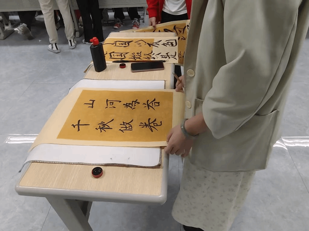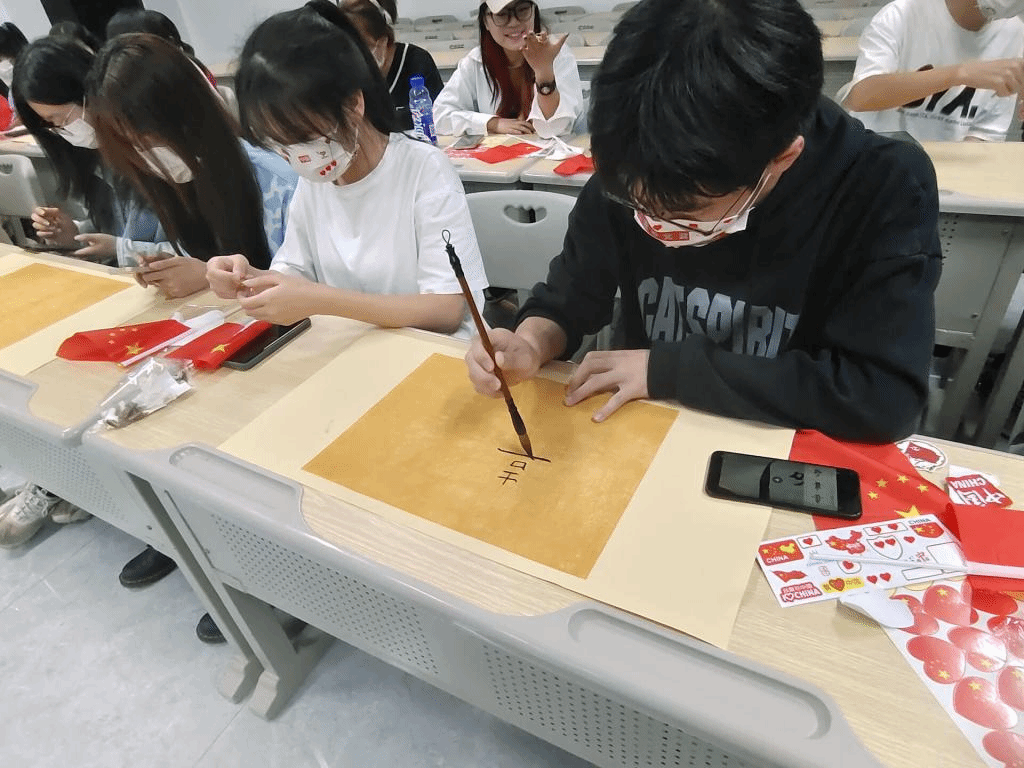 历史的长河带着时代的责任,穿过迷雾,驶向希望。鲁迅先生说:“饰文字为观美”,为“华夏所独”。书法是中华民族独创的一种艺术,是中华民族的优秀传统文化之一。为了增强同学们的文化自信,感受书法的艺术魅力,让大家现场学习体验,书写出自己的志向或对家国的感恩之情,并体会中国文字的三美:“意美以感心,一也;音美以感耳,二也;形美以感目,三也。”