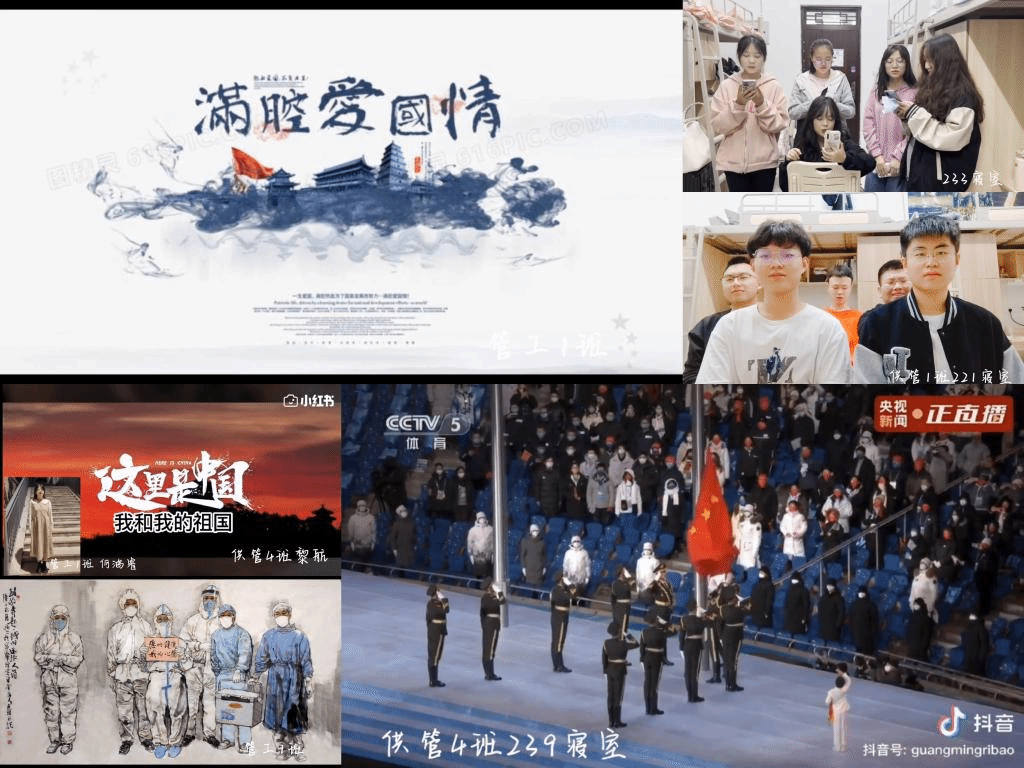 此次年级会在各个班同学录制的祖国赞歌视频的温馨氛围中揭开了序幕,视频中有供应链4班同学录制的歌曲《一起向未来》,展现了“更高、更快、更强、更团结”的奥运精神;有供应链1班寝室合唱的《我和我的祖国》;还有管工1班同学演唱的《我爱你中国》等。同学们积极投稿,将自己的爱国之情通过歌声有感情的地表达了出来。歌唱视频过后,我们带领同学们观看了热血的爱国视频,视频中,往代青年激情的宣誓、先辈们坚定的决心、残酷的战争场面让同学们心生敬畏,内心满是感恩与坚毅。