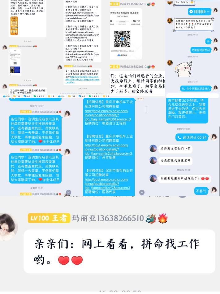 11月以来疫情突发,原计划举办的线下招聘会被迫按下暂停键,但我校积极联系用人单位,开展线上招聘会,并通过各学院老师向同学们发布上千条就业信息,主动开展线上就业讲座,手把手进行就业指导,形成我校就业指导网络线。QQ群里也总会弹出辅导员马莉老师发布的就业信息和对大家的关心。“亲亲,找工作累不累”“在寝室云端找工作没”。而此次年级会马老师着重提醒大家要做好身份的转变,即从2019级本科生转变成2023届毕业生。同时指出在校封控管理期间,大家也要及时关注就业信息,打开思路;认真制作简历,突出个人特色;鼓励大家多尝试,果断抓住机会,切莫害怕失败。