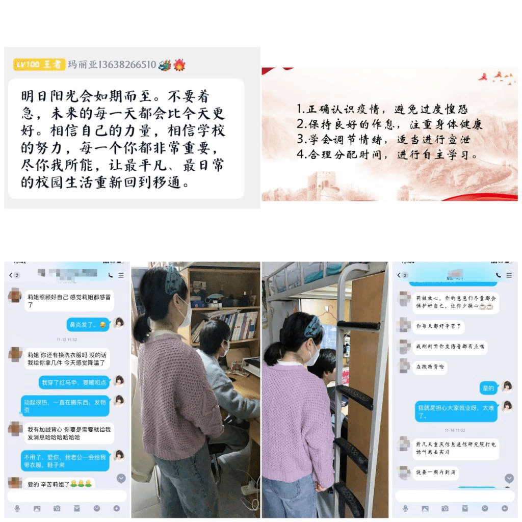 为深入贯彻落实学校疫情防控工作要求,共筑疫情防控安全防线。辅导员马莉老师就目前疫情形势进行分析,当前我校疫情防控稳定向好,但大家仍不能掉以轻心,并呼吁同学们要理解支持、积极配合学校疫情防控工作,要有大局意识,严格遵守校规校纪,共同打好本次疫情防控攻坚战。随后,马老师为同学们分享了近期自己作为志愿者的些许感受与感慨:志愿工作虽苦,但感动常在;虽不能与学生亲自面对面,但每一份餐饭、每一条消息都包含着老师们的浓浓爱意。