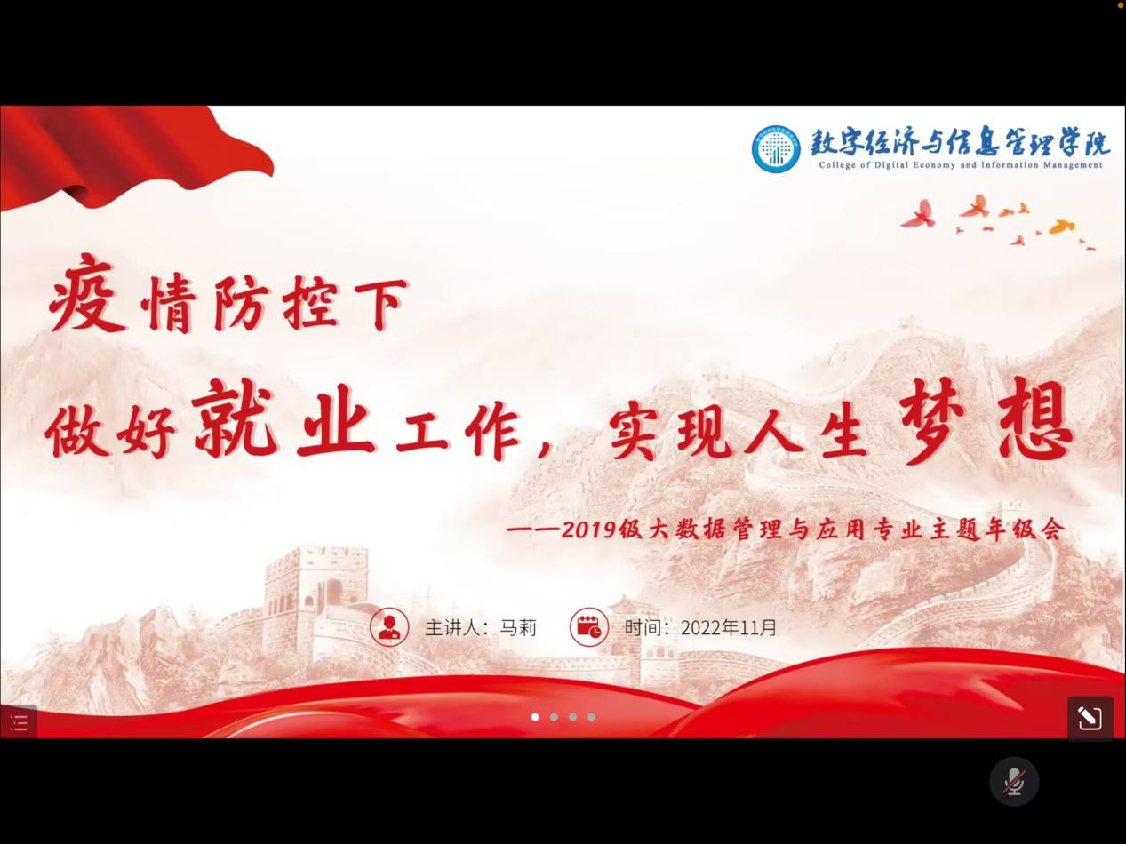 面对来势汹汹的疫情,为保障全校师生的健康与安全,我校及时启动疫情防控工作打响这场无硝烟的疫情阻击战。而突如其来的“暂停”对同学们的学习、就业等方面增加了一系列不确定性,为增强大家的疫情防控意识,调节心理压力,提高就业能力,2019级大数据管理与应用专业于2022年11月22日21:00以线上年级会的方式开展“疫情防控下,做好就业工作,实现人生梦想”主题年级会。