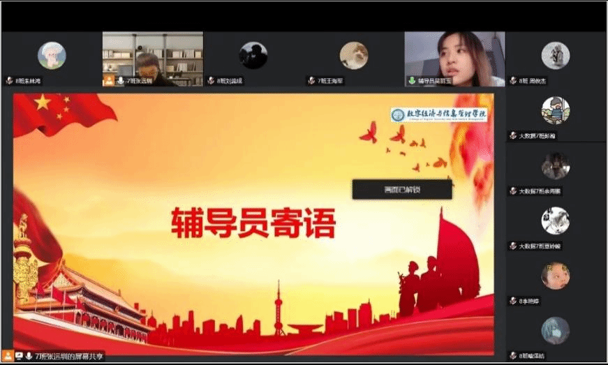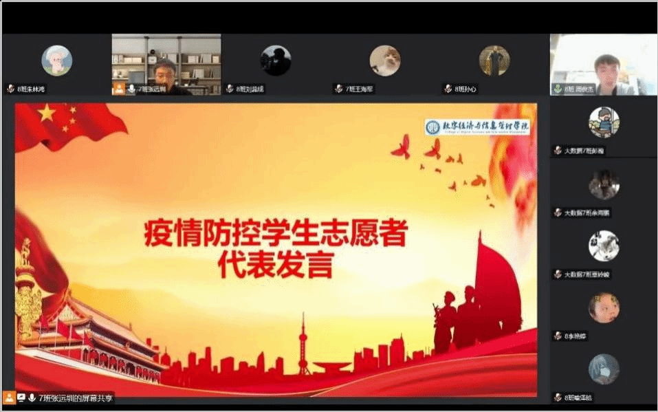 仰望长空,是红旗飘扬;垂眸脚下,是华夏沃土。我们的祖国古老而伟大,伟岸而壮丽,每一个中华儿女都能骄傲地呼喊她的名字——“中国”。爱国主义是中华民族精神的核心,对于当代中国青年来说,热爱祖国是立身之本,为培养同学们的爱国主义情操,深入学习党的二十大精神,11月23日19:00,数字经济与信息管理学院2022级大数据管理与应用专业专升本1-8班在腾讯会议开展了以“不忘初心·牢记使命”为主题的爱国主义教育活动。本次会议由7班班长张远圳同学主持,1-8班全体学生代表参与。