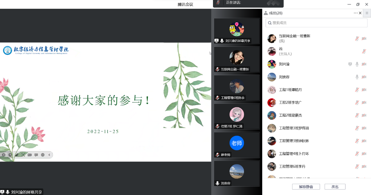 所爱隔山海,山海皆可平。突如其来的疫情使重庆全城戒严,但疫情也阻挡不了老师们对同学们的关爱。封闭管理期间,为了让同学们有问题可以及时与老师沟通解决,数字经济与信息管理学院第十三周院长对话以线上会议的形式于2022年11月25日14时开展。本次会议有幸邀请到了数字经济与信息管理学院院长潘显兵教授,副院长刘贵容教授,2022级专升本辅导员代表廖阳老师,科任老师代表胡红琼老师、张红老师和徐俊颀老师。参与本次会议的还有2022级专升本工程管理1-6班、信息管理与信息系统专业1-2班的学生代表。