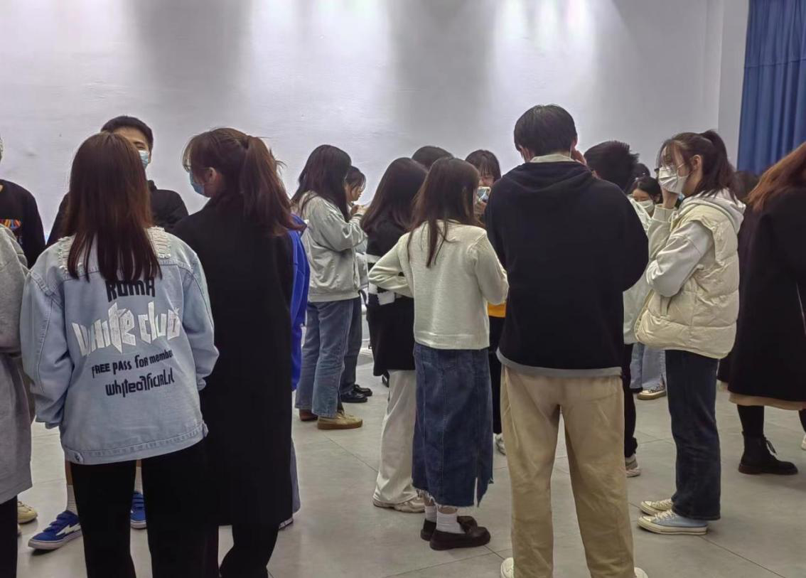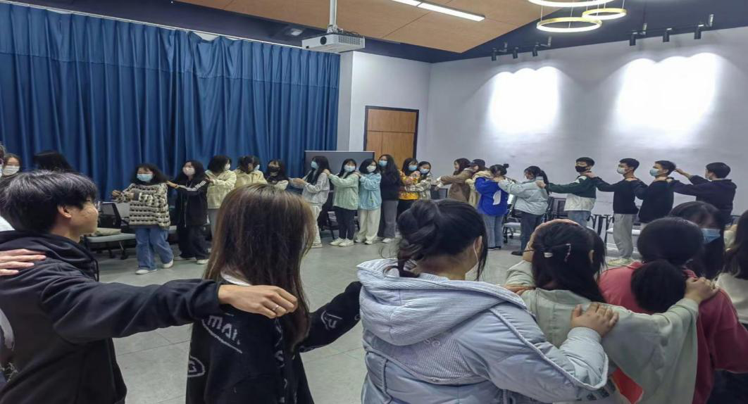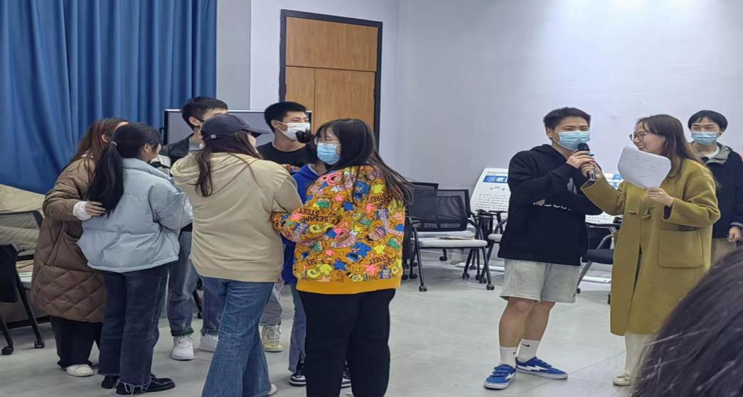 活动主要以团队游戏的方式让同学们增强团队合作,促进团队成员们之间的感情,增强凝聚力。活动开始,全体同学在王颖老师的带领下进行了热身活动“互助拍背”,同学们围成一个大圈根据老师的口令做出相应的动作,同学们很快融入起来,现场气氛也迅速地活跃起来,瞬间提高了同学们的参与感。