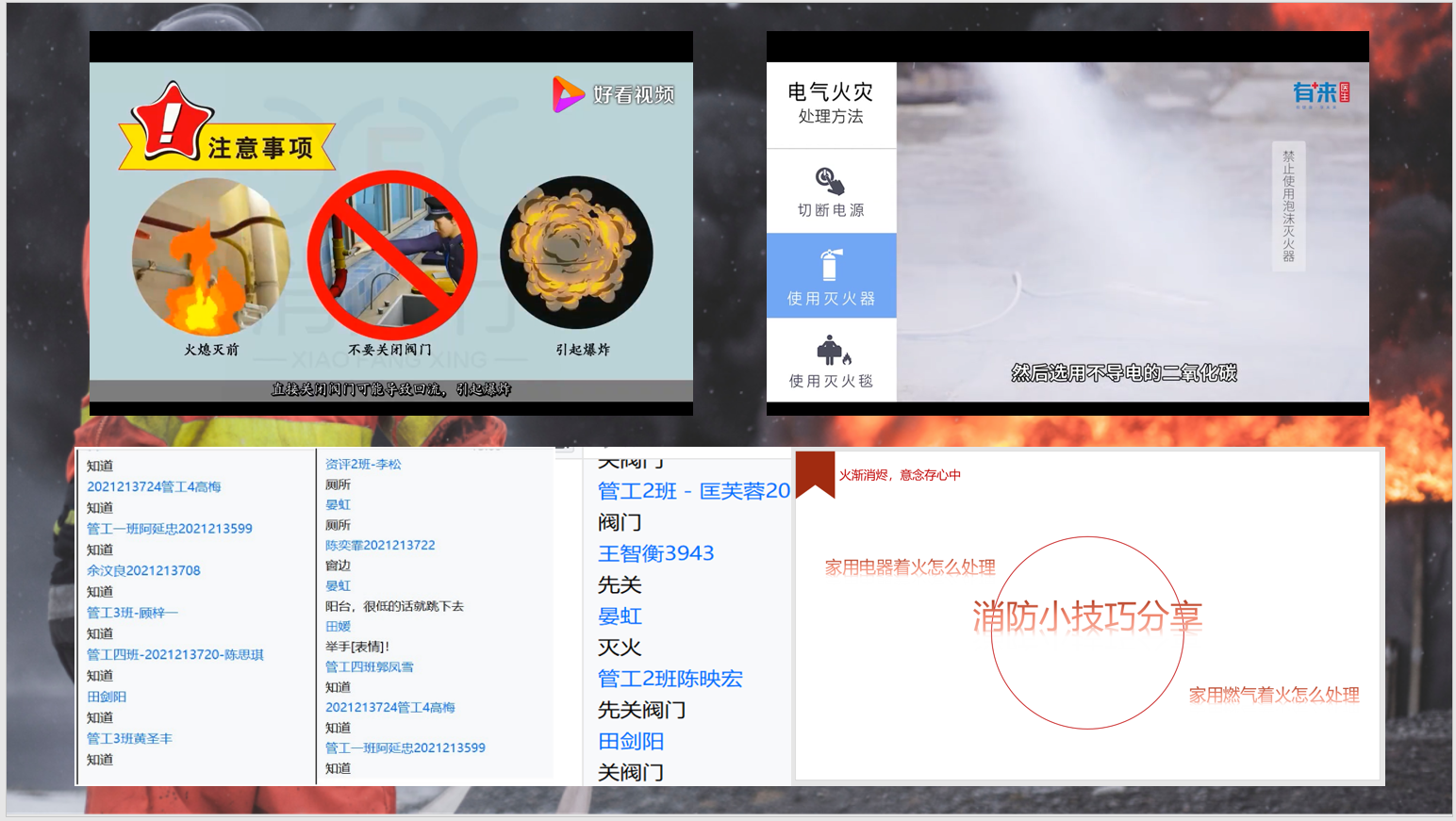 本次年级会,有辅导员讲解如何处理火灾问题,也有同学们的想法补充,我深刻认识到了火灾隐患问题就时刻在我们身边徘徊,当家里没人时要及时断电断气,在寝室不能使用大功率电器,在遇到险情时,要从容淡定的面对,切记在保证自己安全的情况下,才可以去保护周围的人物。
