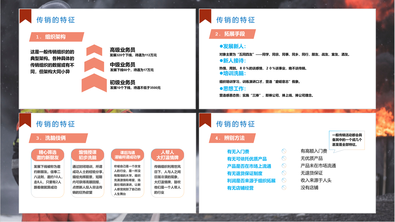 作为一名大学生,还涉世未深,对于传销等诈骗犯罪手段没有较强的防范意识,不知不觉就遭了人家的道。传销组织通过洗脑的方式,通过二八法则、封闭培训让所谓的成功学大师来洗脑,通过打温情牌,使学生沉醉其中,警方在破获传销组织后,往往还有人没有醒悟过来。王瑞老师还讲了传销组织的辨别方法,传销的手段也是在与时俱进,越来越高级,让人难以一时分清楚其性质。总之一是拒绝非法传销组织的种种诱因,如对毕业生提供条件优越,高薪的工作;二是不要轻信亲朋好友,同学的邀请;三是克服急功近利,一夜暴富的不正确观念,要树立正确的世界观、人生观。最后还是要引用习近平主席的话:“天上不会掉馅饼,努力奋斗才能梦想成真。”