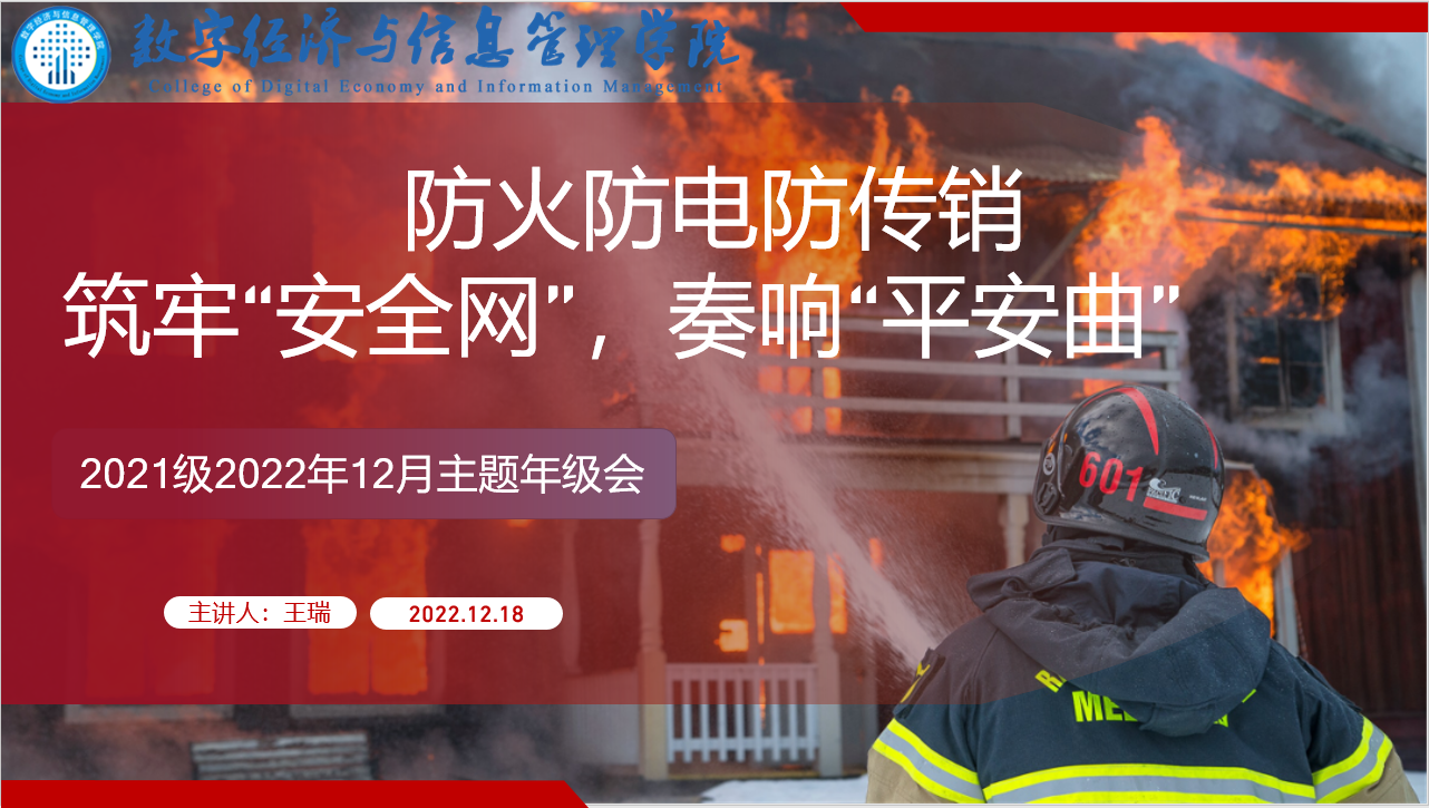 为了增强学生的消防安全意识以及在假期内的安全防护意识,提高学生保护自身生命健康财产安全的能力,数字经济与信息管理学院2021级管理科学与工程类、资产评估专业于2022年12月18日中午12:30通过腾讯会议线上开展“防火防电防传销,筑牢‘安全网’,奏响‘平安曲’”主题教育年级会。会议由辅导员王瑞老师担任主讲人,2021级管理科学与工程类、资产评估专业全体同学参会。