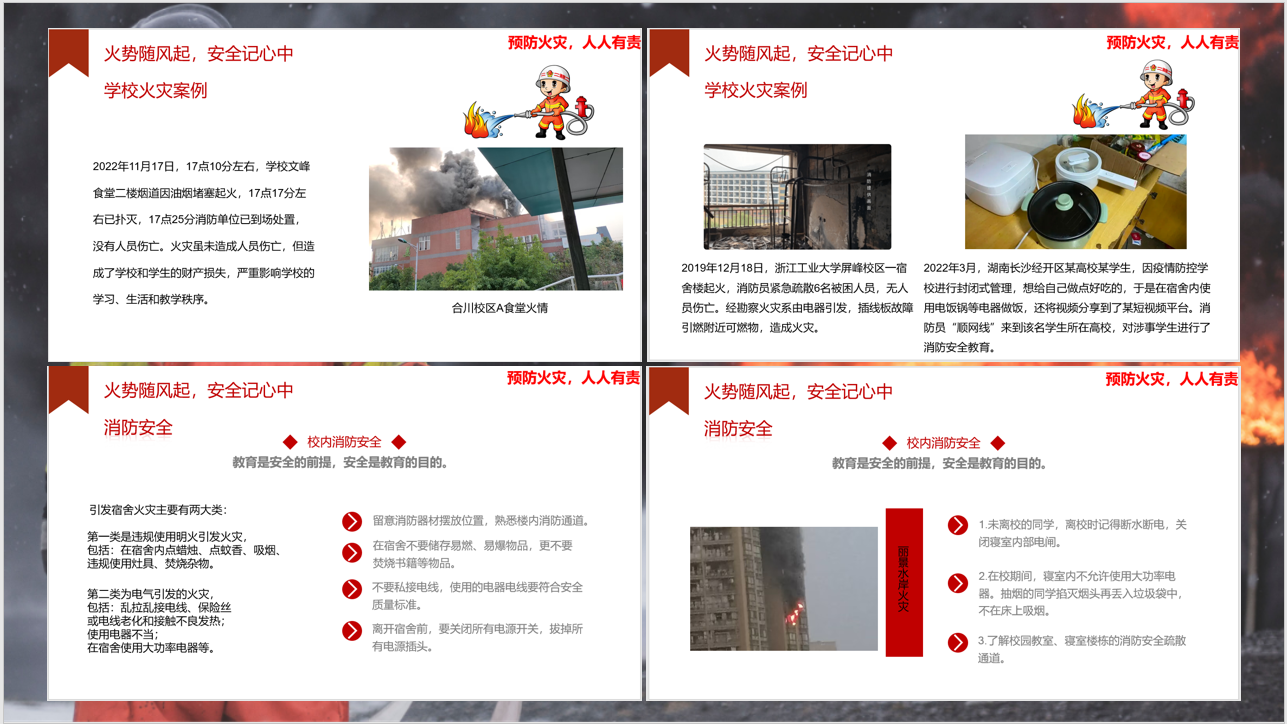 生于忧患而死于安乐。每一场火灾都伴随着人的疏忽大意,加强消防安全教育,做到防范于未然。王瑞老师提到,冬季作为大功率取暖电器使用的高发期,尤其是离校返乡后,学生可能独自在家,不经意间就会导致惨剧的发生。在校期间,导致宿舍火灾的原因有两大类,一是使用明火、二是使用大功率电器。火灾发生在身边才能刻苦铭心,合川校区文峰食堂也就是A食堂,因为油烟管道堵塞,引起了火情,好在没有人员伤亡,学校与消防单位处置及时,火情及时得到了控制。不管是家庭还是学校发生火灾,都应该了解消防安全疏散通道。家中常备消防器、灭火毯,逃生面罩等等。增强消防意识,学习消防知识,预防家庭火灾的发生,确保我们的家庭平安幸福。