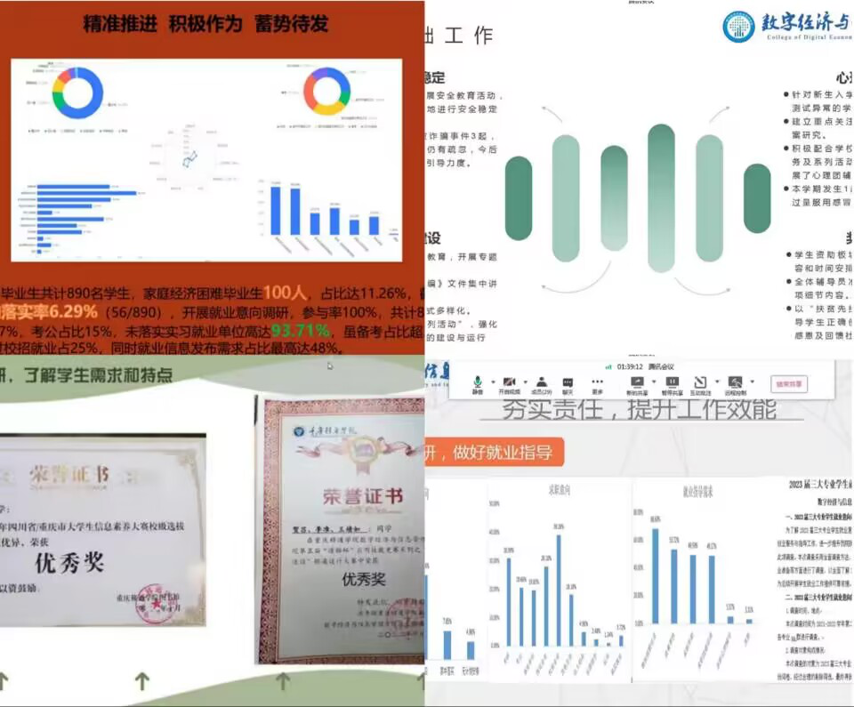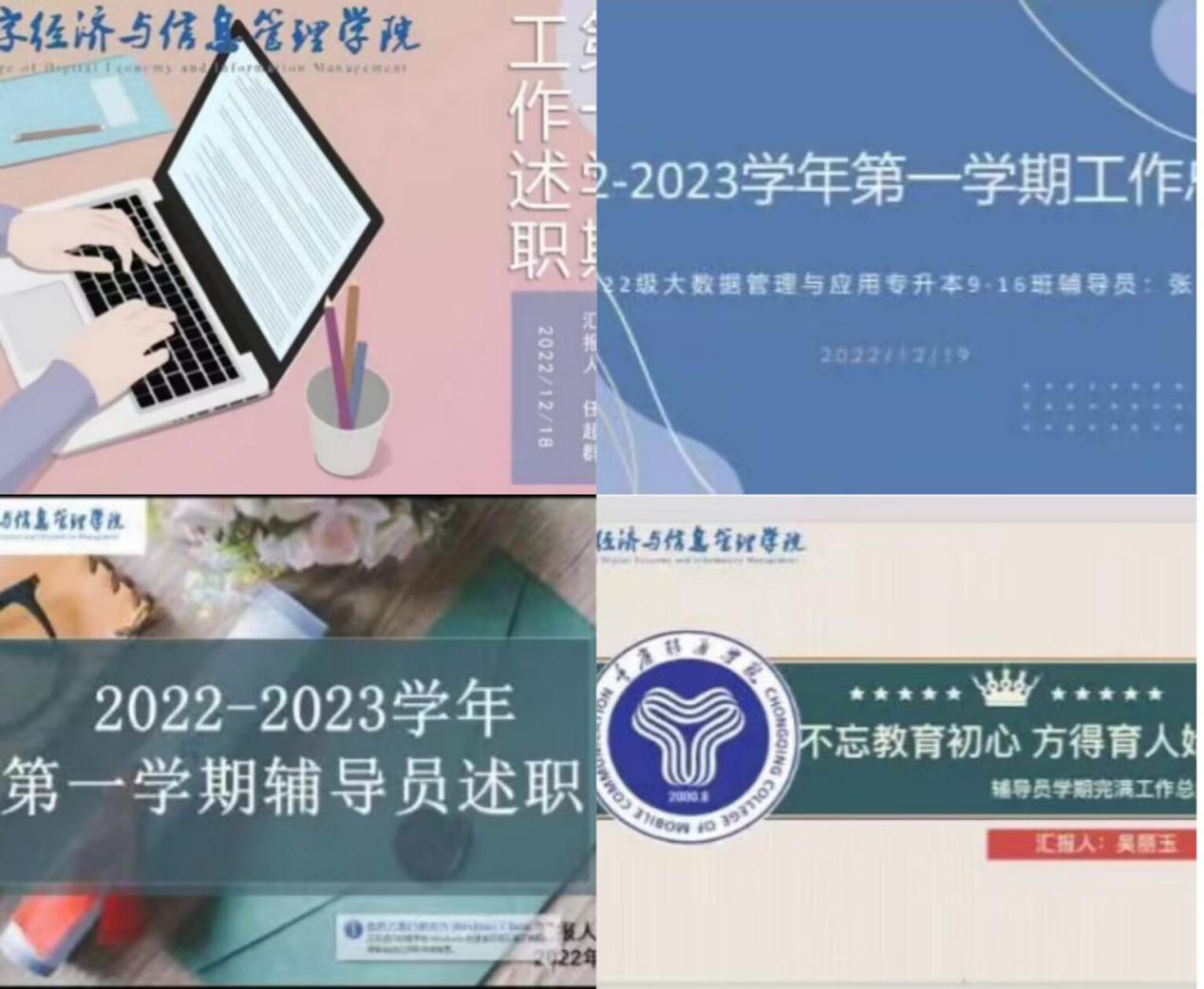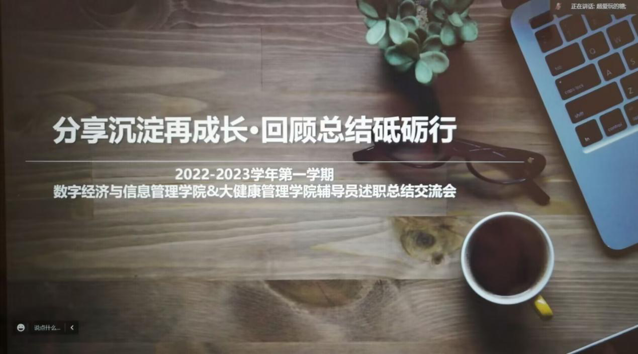 凌冽寒风难以磨灭对工作的热情,2022-2023学年第一学期已然到达尾声,为提高双校区辅导员工作效率,深入了解各位辅导员的工作成果与工作中存在的不足,做好未来规划。数字经济与信息管理学院和大健康管理学院的辅导员们于12月19日10:00在腾讯会议上开展2022-2023学年第一学期辅导员述职总结交流会暨数字经济与信息管理学院“青椒成长计划”第四期培训,本次会议由数字经济与信息管理学院学工副院长任瑞娟老师主持,双校区16位辅导员依次进行交流总结。