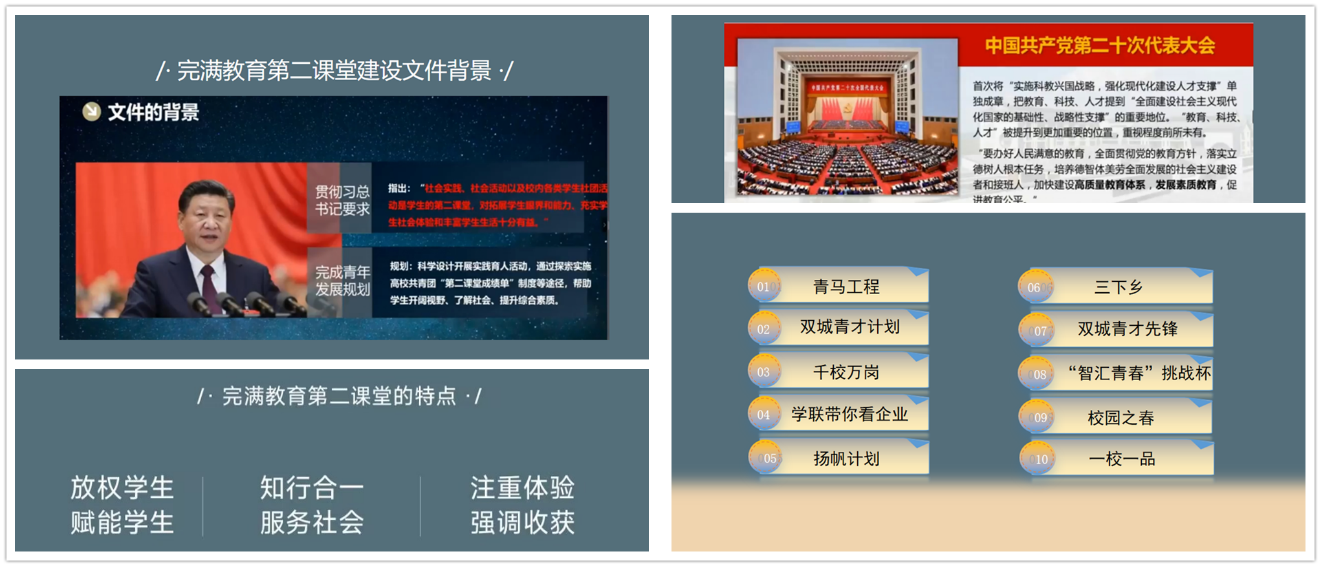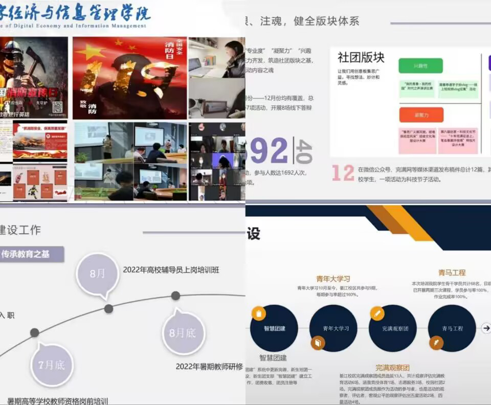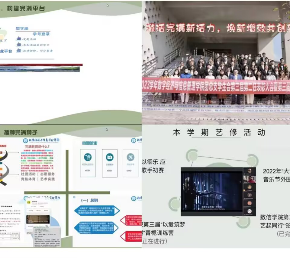 修身为弓,正心为箭,博取而知止修养是腐草化萤的光辉,思想是诠释自我的明灯。由此可见,各方面的全面提高,能够实现自我的强大,为追求理想而奠定基石。每个辅导员都在尽力培养学生的能力,力求为国家培养出更好的人才,鼓励学生们树立远大理想并为之奋斗。辅导员刘琳、任超群等多名老师作为完满教育四大版块的指导老师,尽心尽责的为同学们讲解完满教育。社团版块刘琳老师总结到社团在组织活动时对相关活动文化挖掘不够深入,社团本身优势不够突出,宣传力度以及重点划分都还不够明显,在未来我们应重点放在专业型,学习型,成长型社团的打造。在这半学年来,通过老师们的指导与引领,我们成功开展了很多次完满活动并取得优异的成绩。