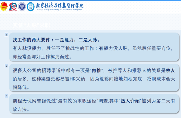 有效的信息也在我们的就业上起着至关重要的作用,马莉老师以自身经历向我们讲解其中的重要性。在高校毕业生就业过程中,用人单位、大学毕业生和企业的选择都是双向的,当你在努力打造完美简历时,企业也在思考如何发现简历“注水”的情况,这种信息不对称是在求职过程中同学们都要面对的。所以,珍惜身边的资源、开拓信息渠道就显得尤为重要。我们还通过老师、家长、校友、已就业的同学一起带动未就业的同学,提供各类招聘信息,积极为同学们推荐等措施开展精准帮扶。