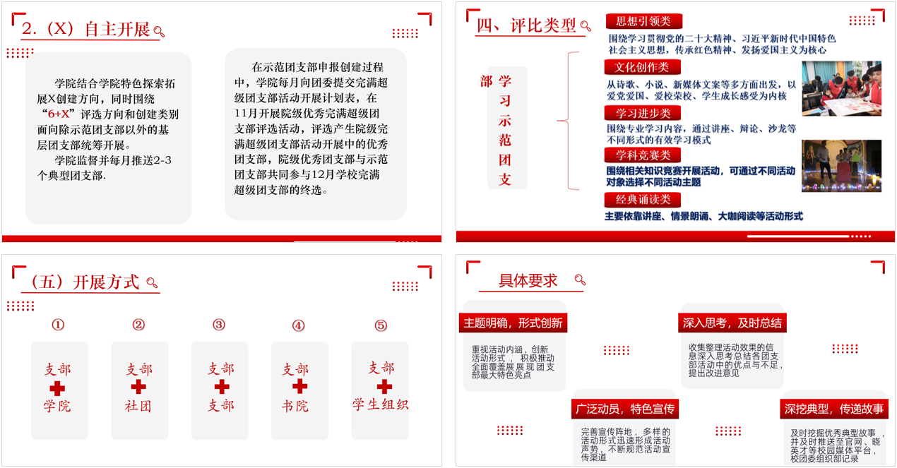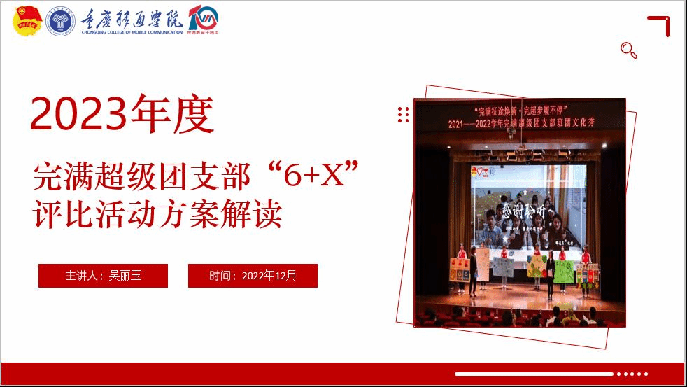 随后辅导员吴丽玉老师着重讲解了:完满超级团支部活动评比体系的“6+X”,强调要学会结合自身特色,拓展x创建方向,学会创建典型活动。辅导员提出殷切期待,希望各团支部注重完美超级团支部活动质量,明确自身支部开展方向,创新活动形式,最大化展现支部特色亮点。通过新颖多样的活动形式迅速形成活动声势,营造良好的活动氛围,在活动中提升班团凝聚力与集体荣誉感,充分彰显各自的文化与风采。