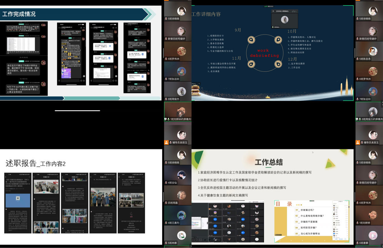 会议前夕,辅导员吴丽玉老师以图文并茂的方式对本学期学院开展的各项工作进行了简略的概述,然后在辅导员吴丽玉老师的引导下,本次以“踔厉奋发,笃行不怠”为主题的述职会议正式开始。大数据管理与应用专升本1-8班助理、班长、团支书、各班委依次进行了述职。