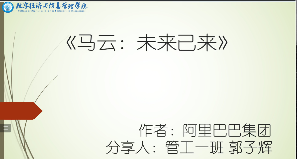 接下来,由管理科学与工程类(1)班郭子辉同学带来他的分享——《马云:未来已来》,他总结出三个要点:第一,要乐观的看待问题;第二,要少抱怨,认真检查自己的问题;第三,要有超越常人的坚持。他号召同学们积极参与到时代的变革当中,了解这是怎样的一个过程,主动推测未来又可能是怎样的,去感受科技带来的奇迹,成为新兴时代下拥有主动性、探索性的年轻人。