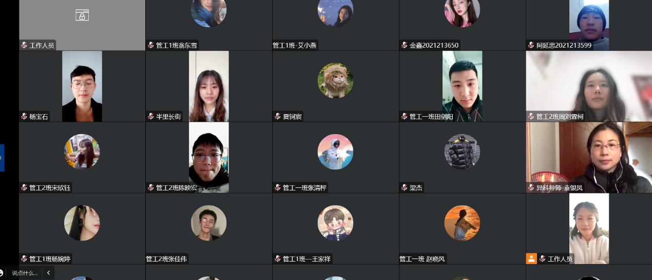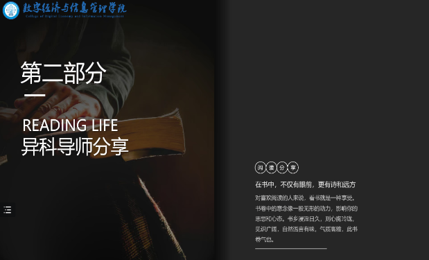 火冷灯稀霜露下,昏昏雪意云垂野。最后,由管理科学与工程类异科导师杨宝石老师、袁银凤老师与大家分享他们的大咖阅读之道。杨老师灵活引用《雷军传》中的鲜明事例,明确指出:实践是检验真理的唯一标准。书籍是一个很好的学习途径,而如何读书、读好书就显得十分重要,杨老师建议大家将精读、简读、小组共读一本书结合起来,有效率的阅读会帮助大家不断精进。袁老师也分享了一段话:“读书就像渴了要喝水,饿了要吃饭,困了要睡觉,痛苦了迷茫了伤心了,都可以去看书,书不一定能回答你的问题,但书能让你不纠结这些问题。” 阅读非一蹴而就,多学习,多实践,躺平不可取,努力才是真。