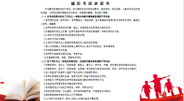 在即将到来的期末考试面前,吴老师带领同学们仔细阅读学校的诚信考试承诺书,告诫同学们要努力复习,不抄袭,不作弊。诚信是为人之本,习书记讲过“打铁还需自身硬”,学到的知识才是真的知识,而对于考试作弊者将会按照规定进行处罚。