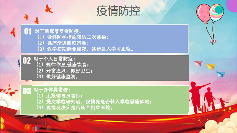 除此之外,老师重点强调了在安全方面,我们不单单是要面对可能存在的疫情做好疫情防控工作,有问题及时上报,还应当做到健康生活,合理搭配饮食,适当运动,提高身体免疫力,更要学会自我心理疏导,做自己的情绪管理者。面对空闲了两个多月的寝室,吴老师更是提醒同学们消防安全绝不放松,不在寝室使用大功率电器以及违规物品。
