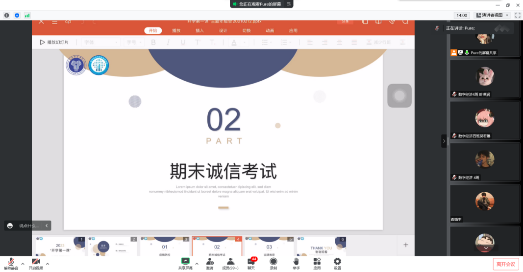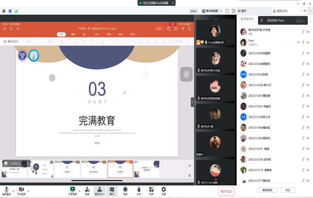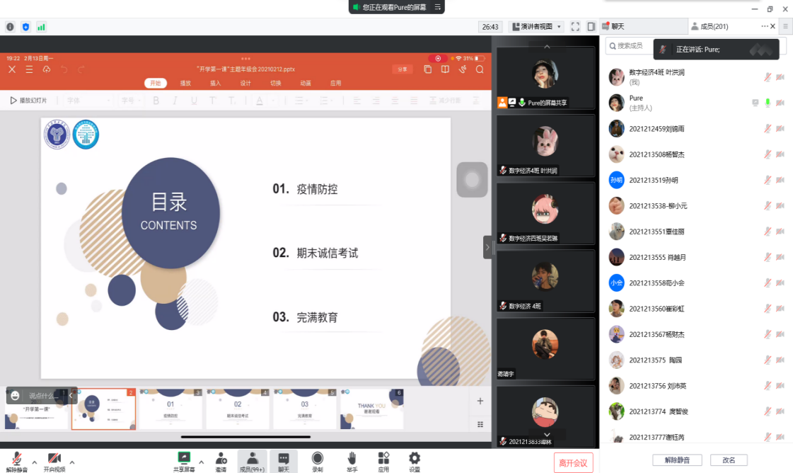 风雨载满家乡味,久别重逢笑颜开。告别寒假的数信学子又开始新一阶段的校园学习生活。临近开学考试,为新学期防疫意识的普及以及让同学们更好地投入复习,于2023年2月13日,数字经济与供应链管理专业全体学生开展以“开学第一课”为主题的年级会。本次年级会采取线上召开的模式,由辅导员刘琳老师主持。