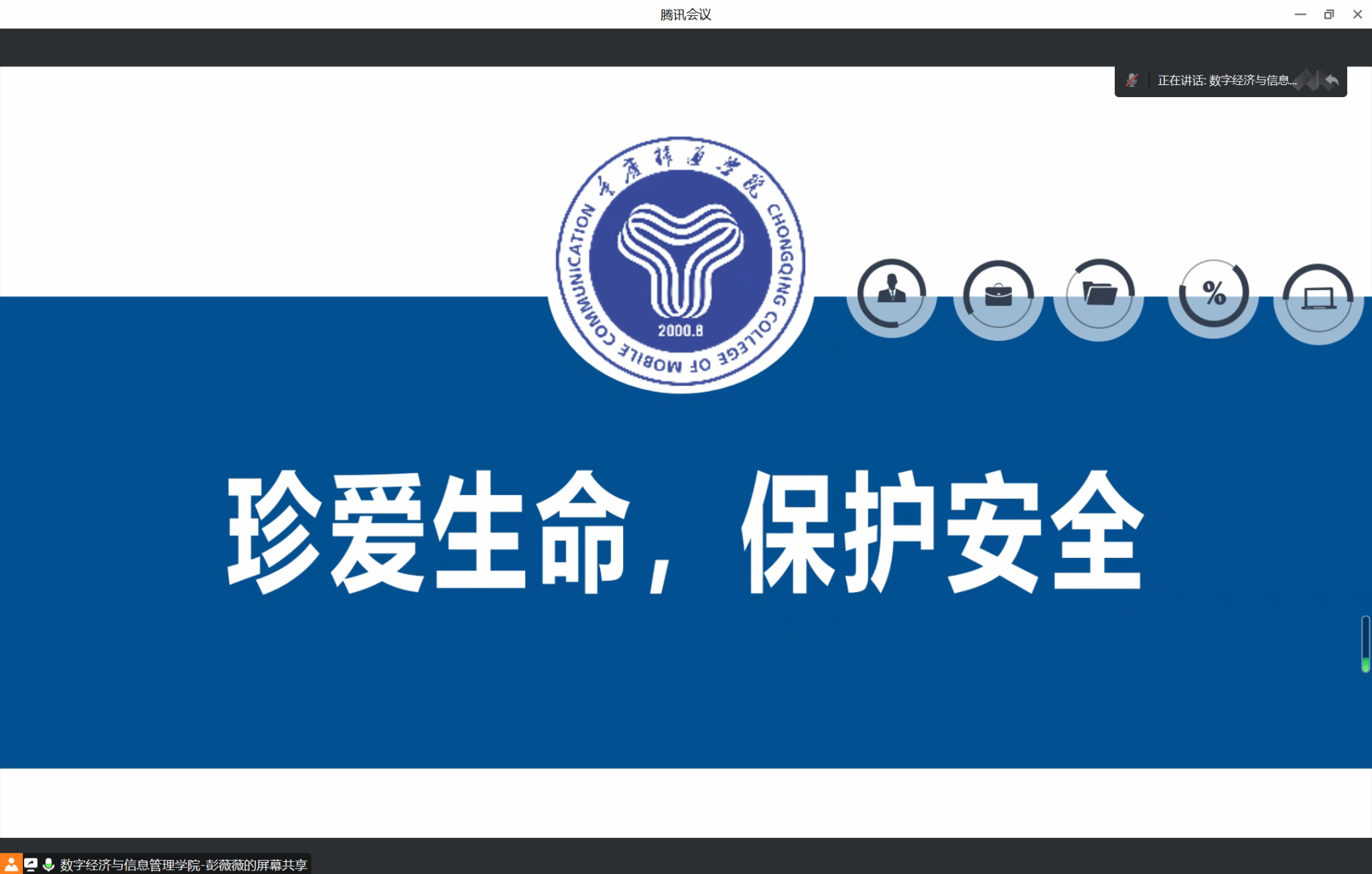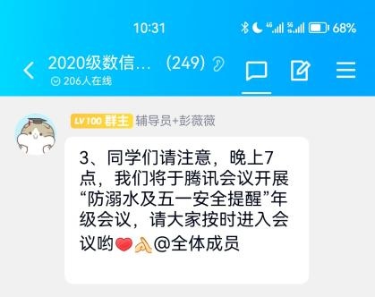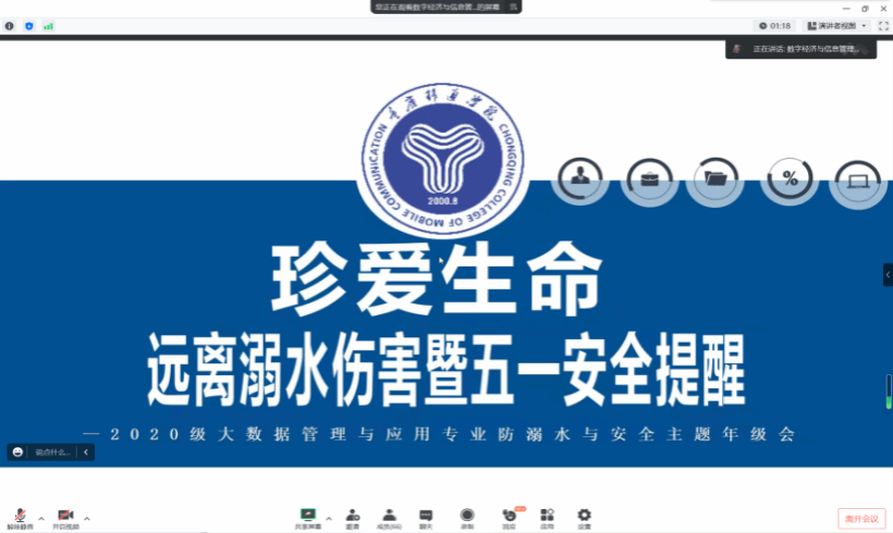 随着夏季来临,学生溺水事故进入易发、多发期,为让学生们度过一个安全愉快的假期,增强学生假期的安全意识,提高学生假期的自我防护能力,避免溺水事故的发生,2020级大数据管理与应用全体成员于2023年4月25日晚7点在线上开展了“防溺水及五一安全提醒”年级会。