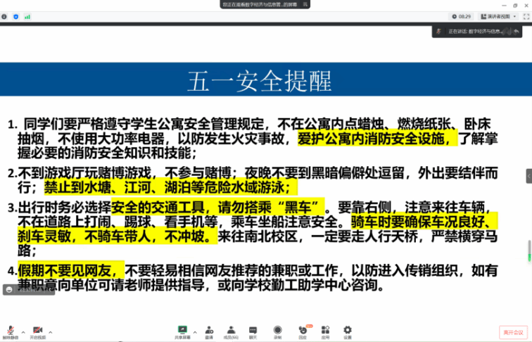 紧接着,彭薇薇老师提出五一假期令人激动,校规校纪也需遵守。在放假之前,同学们也需要遵守课堂纪律、按时上课,不要晚归。并从宿舍安全、出行安全、财产安全、防诈骗、拒绝校园网贷、请假流程等方面逐一强调。重点强调了外出同学严格遵守校规校纪,按照要求履行请假手续,如有特殊情况无法按时返校,请严格落实请假流程,家长打电话联系。