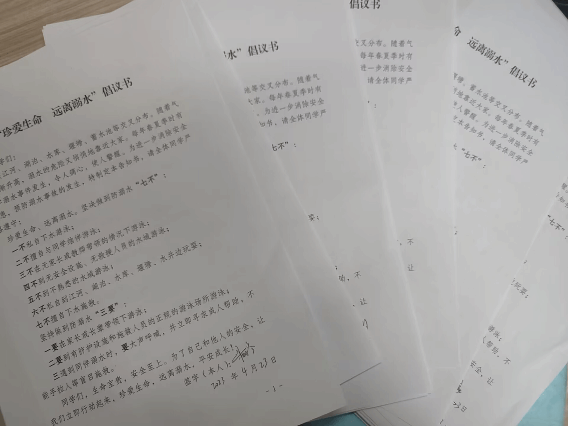 老师针对五一假期天气炎热,一再强调要注意防暑和防溺水安全。她提醒学生外出游玩务必远离危险水域,游泳也必须去备有安全员的专业游泳馆。前期防溺水承诺书的签订,也更加加强了同学们的意识。