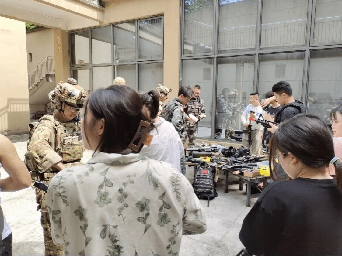 从战火硝烟的小米加步枪到战斗力爆表的武器装备,过去我们钢少气多,新时代的革命军人钢多气少,一件件新型武器装备握在手中。数字经济与信息管理学院2021级管理科学与工程类专业学生、廊桥书院军事爱好者协会成员、退伍军人聂子翔同学为大家详细讲述本次活动使用的各类仿真武器装备,同时还带领大家进行实战演练操作。现场从对枪械的外观构造和基本操作进行详细讲解,各类“武器”实物深深吸引着大家,激发同学们的兴趣。