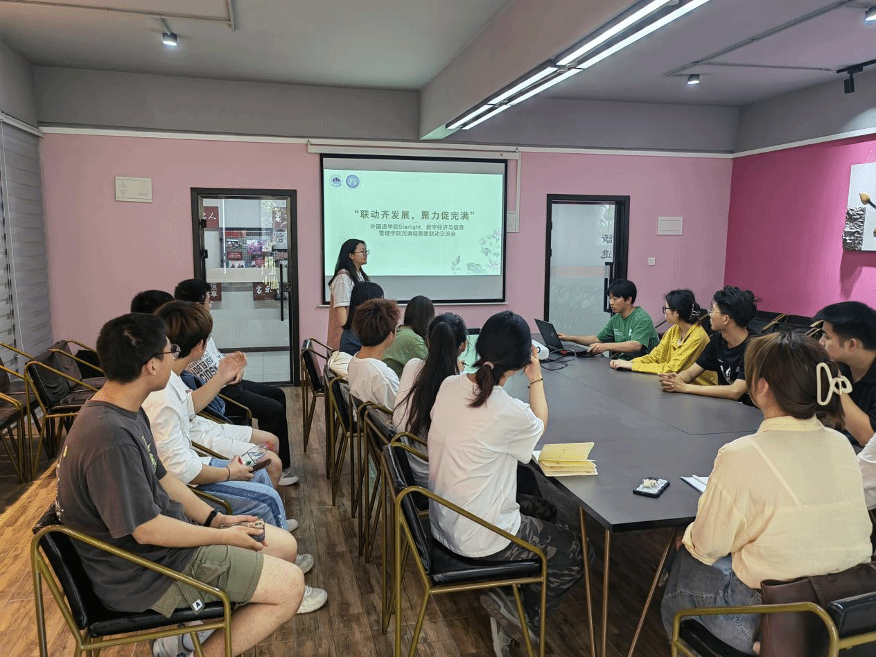 春深四月去,夏来五月新。繁花似锦,绿茵如海,槐香熏陶着五月的大地,为促进两学院之间联动融合以及各成员之间的合作交流,不断提升完满观察工作质量,进一步有效提高完满教育活动师生的满意度,深化完满教育工作,数字经济与信息管理学院联动外国语学院于2023年5月24日12时,在爱莲书院会议室开展“联动齐发展,聚力促完满”完满沙龙交流会。本次交流会邀请到两院的学生会干部以及完满观察团成员。同时还邀请到数字经济与信息管理学院团总支书记马莉老师、外国语学院艺术修养与实践版块指导老师屠建丽出席本次交流会。本次交流会就双方完满观察团成员工作开展中的问题、疑惑进行交流、探讨。