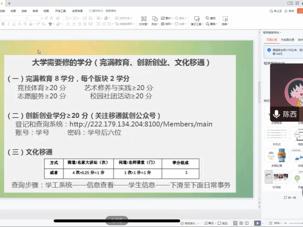 会议伊始,陈西老师讲到,完满教育学分需要同学们通过悠学派报名参与活动,专升本的学生需要在四个版块各达到20分,此学分关乎同学们是否达到毕业标准;因下学期面临实习,所以提醒未修完的同学们须得抓紧时间积极参与活动中去。