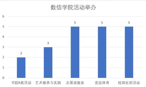 志愿者服务类活动同样备受瞩目,共举办了5场。学生们积极投身志愿服务,传递爱心与温暖,为社会贡献了自己的力量。这些活动不仅提升了学生的社会责任感,也增强了他们的公益意识。此外,书院建设类活动也取得了显著成果。通过2场活动的举办,学生们对书院文化有了更深入的了解,也为书院的建设和发展贡献了自己的智慧与力量。竞技体育类活动同样精彩纷呈,共举办了5场。学生们在比赛中展现了顽强拼搏的精神和出色的竞技水平,也通过比赛增进了友谊,提升了团队协作能力。