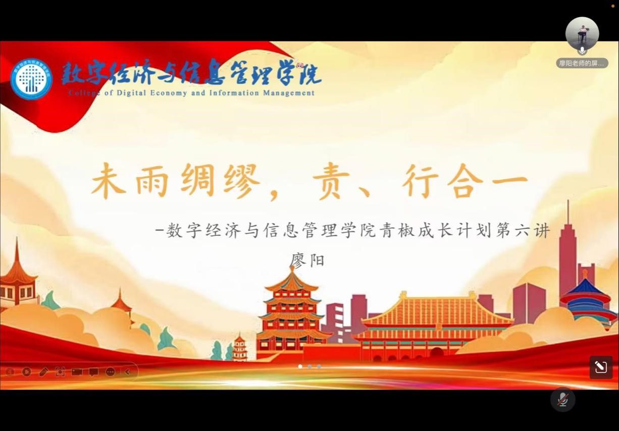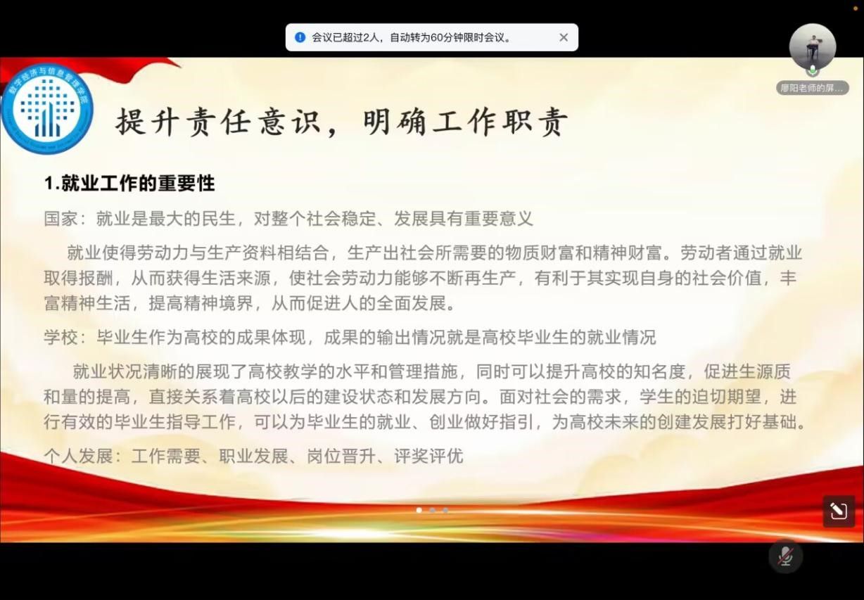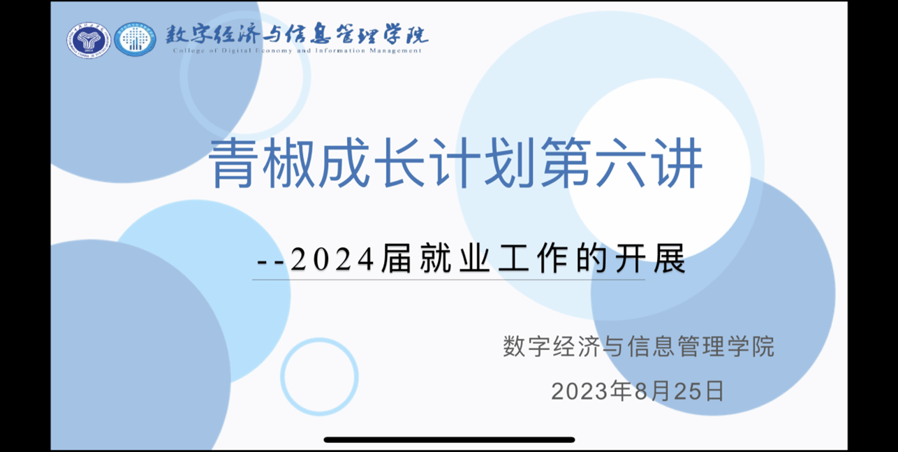 为加快推动2024届毕业生的就业指导工作开展,切实落实就业相关工作,为毕业生提供更好的就业服务指导与支持。数字经济与信息管理学院于8月25日17:30在线上平台开展了“2024届就业工作的开展”为主题的青椒成长计划第六讲暑期就创活动。本次活动由数字经济与信息管理学院学工办主任廖阳老师主讲,我院学工副院长任瑞娟老师、双校区全体辅导员老师共同参与。