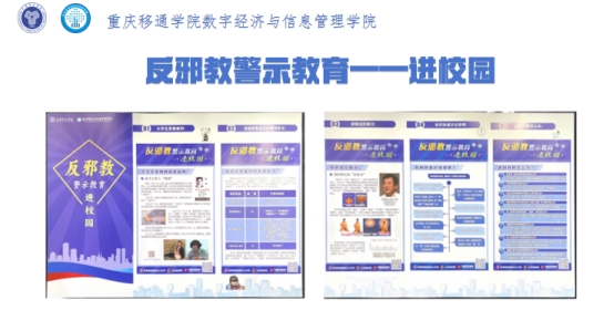 为认真贯彻落实党的二十大精神,进一步加强校园反邪教警示教育工作,提高学生的反邪教能力,增强学生反邪教的意识,2023年10月期间,重庆移通学院数字经济与信息管理学院以辅导员老师为单位开展了以“反邪宣传进校园,守护青春正能量”为主题系列反邪教宣传活动,不断增强同学们对邪教的认识,营造追求文明、崇尚科学的良好风气。活动期间,我院辅导员老师通过开展主题年级宣讲会、反邪宣传进教室、反邪宣传进寝室等形式加大防邪反邪宣传。