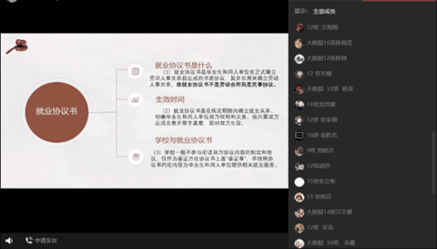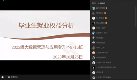 大学生活悄然走向尾声,这一路走来,我们经历了很多,学习、社交、实践、思考,从稚嫩到成熟,从迷茫到明确,我们憧憬着未来,但同时我们也面临着诸多未知的挑战和机遇。在大四,许多同学都开始找工作,去实习。但才半只脚步入社会的我们,该怎样在即将到来的职场中,保护自身的权益呢?面对这个问题,数字经济与信息管理学院2022级大数据管理与应用专升本9—16班全体同学在辅导员张雪老师的指导下,于2023年10月26日19:30在QQ群课堂开展了“毕业生就业权益分析”主题年级会。