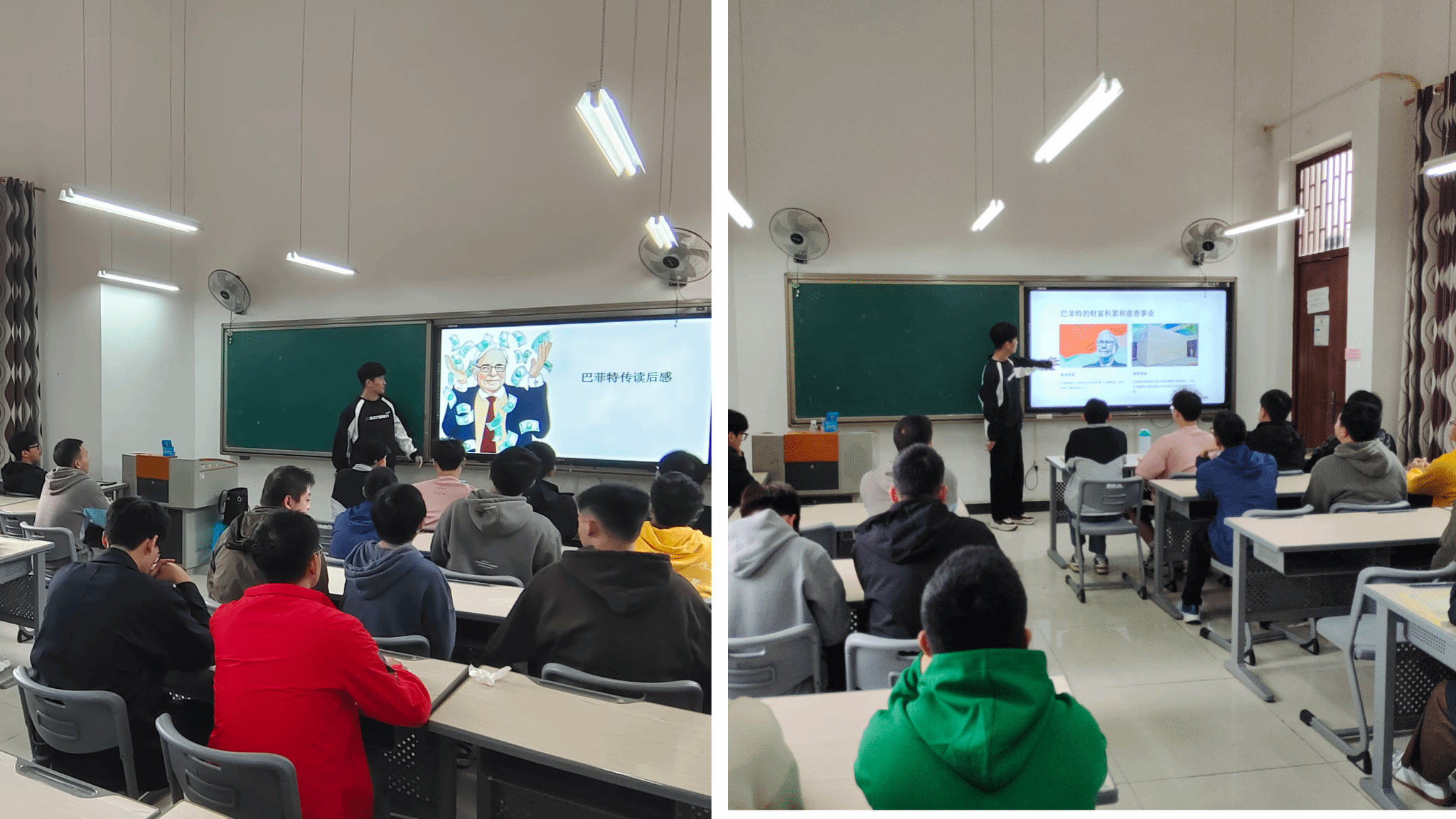 之后,曾萌和黄春林同学也陆续做了分享。曾萌同学谈到浓厚的兴趣和天赋是成功的重要因素。巴菲特之所以成功,因为他天生便对数字有着浓厚的兴趣,即使人们随便说出某个城市的名字,他也能准确的报出人口数、死亡率、赛马胜算等等。由于对数字有天赋这一点,对于投资也是非常有利的。黄春林同学讲到《巴菲特传》勾画了巴菲特一生的投资哲学、人生态度和个人魅力。在读完这本书后,他深刻认识到作为一名大学生,不仅要学会看清科技和社会的发展趋势,更需要在对待个人理念的塑造、团队的管理和决策的执行等方面注重细节。此外,巴菲特传中反复强调的“价值投资”理念也给他留下了深刻印象,让他更加认识到选择优秀的企业和未来趋势的重要性。巴菲特的励志人生和精益求精的态度也令人十分钦佩,他身上散发出的魅力和影响力无疑会影响到一代又一代的人。